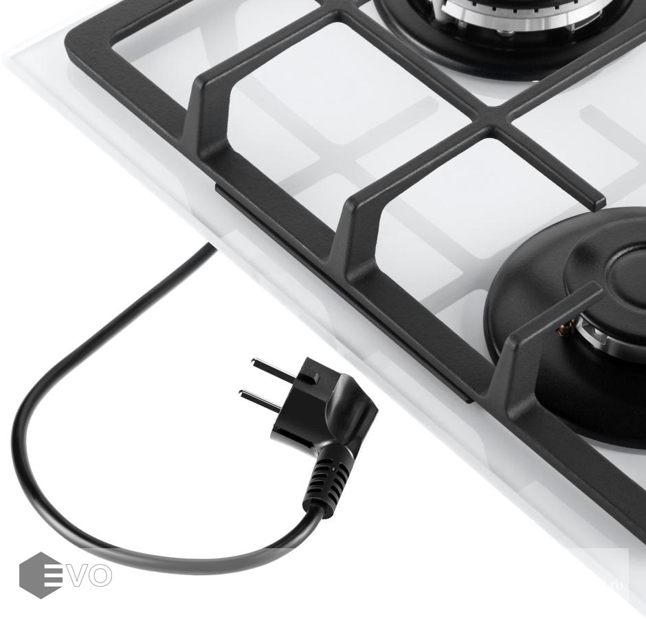 Панель выполнена из закаленного стекла белого цвета. В данной модели установлены итальянские горелки SABAF. Две стандартные конфорки мощностью 1000 Вт, 1700 Вт и одна мощная WOK-конфорка с двойным пламенем мощностью 3000 Вт. Они спроектированы таким образом, что огонь не перегревает ни чугунные решетки, ни ручки управления.