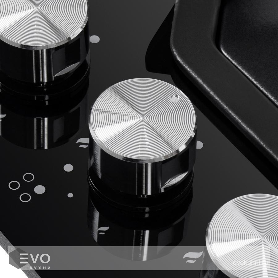 Управление подачей газа и поджигом конфорок происходит с помощью поворотных регуляторов - полнотелых цельнометаллических ручек. Для простоты использования около каждой ручки нанесены информационные изображения: используемая конфорка, подача газа выключена, электроподжиг, максимальное пламя и минимальное пламя.