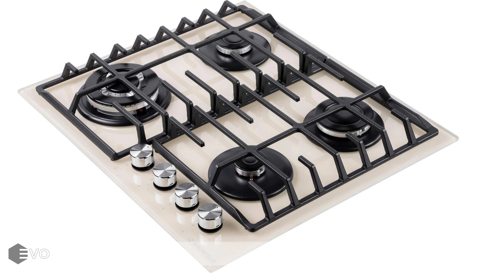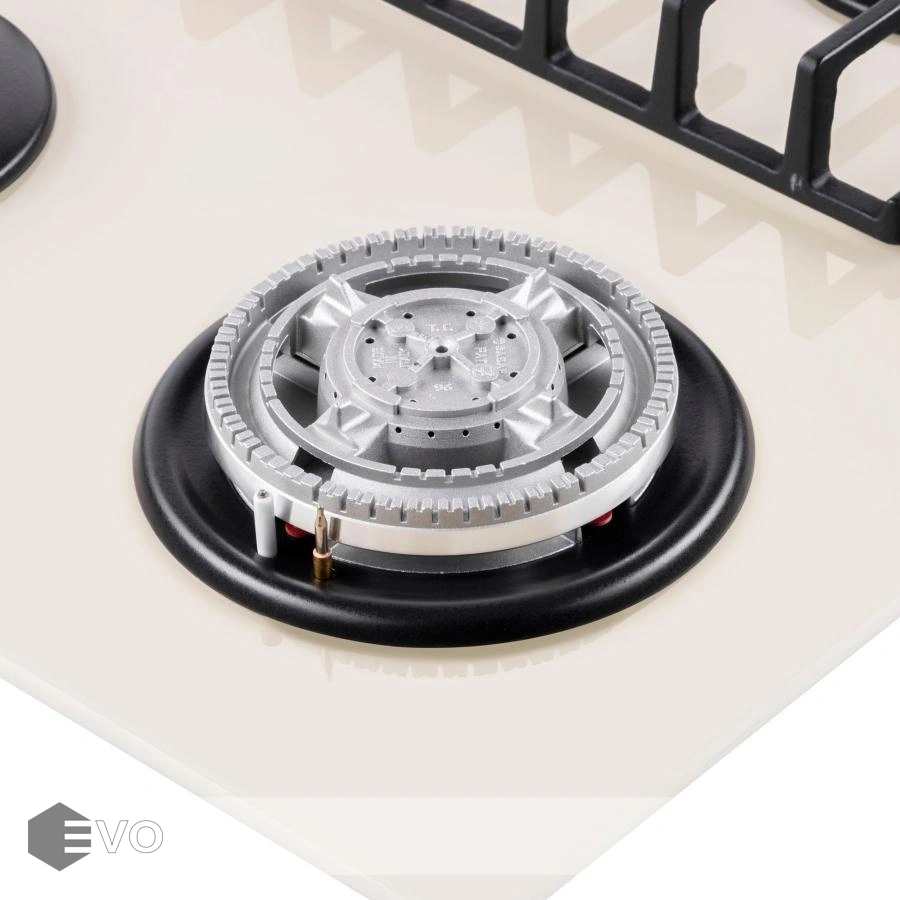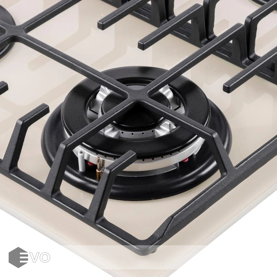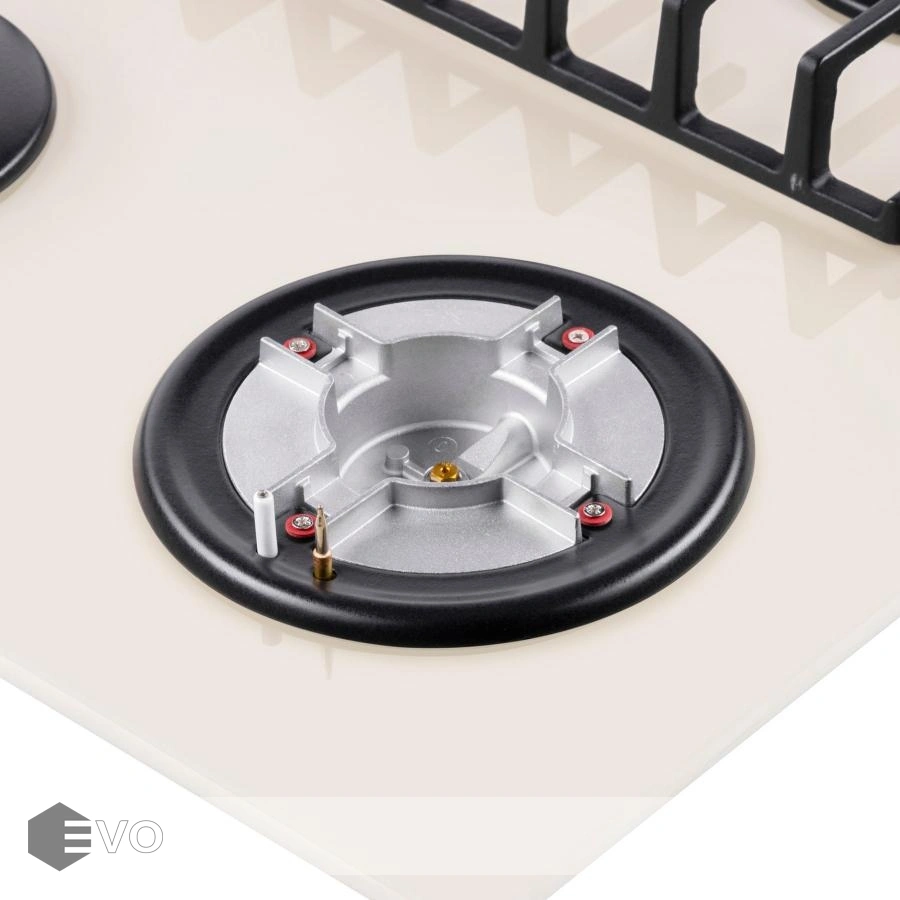 Панель выполнена из закаленного стекла толщиной 8 мм, устойчивого к царапинам, сколам и постоянным перепадам температур. В данной модели установлены высококачественные итальянские горелки SABAF. Три стандартные конфорки мощностью 1000 Вт, 1700 Вт, 1700 Вт и одна сверхмощная WOK-конфорка (3800 Вт) с двойным пламенем, спроектированные таким образом, что огонь не перегревает ни чугунные решетки, ни ручки управления.