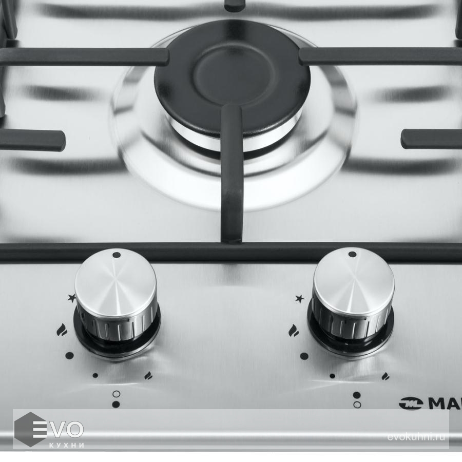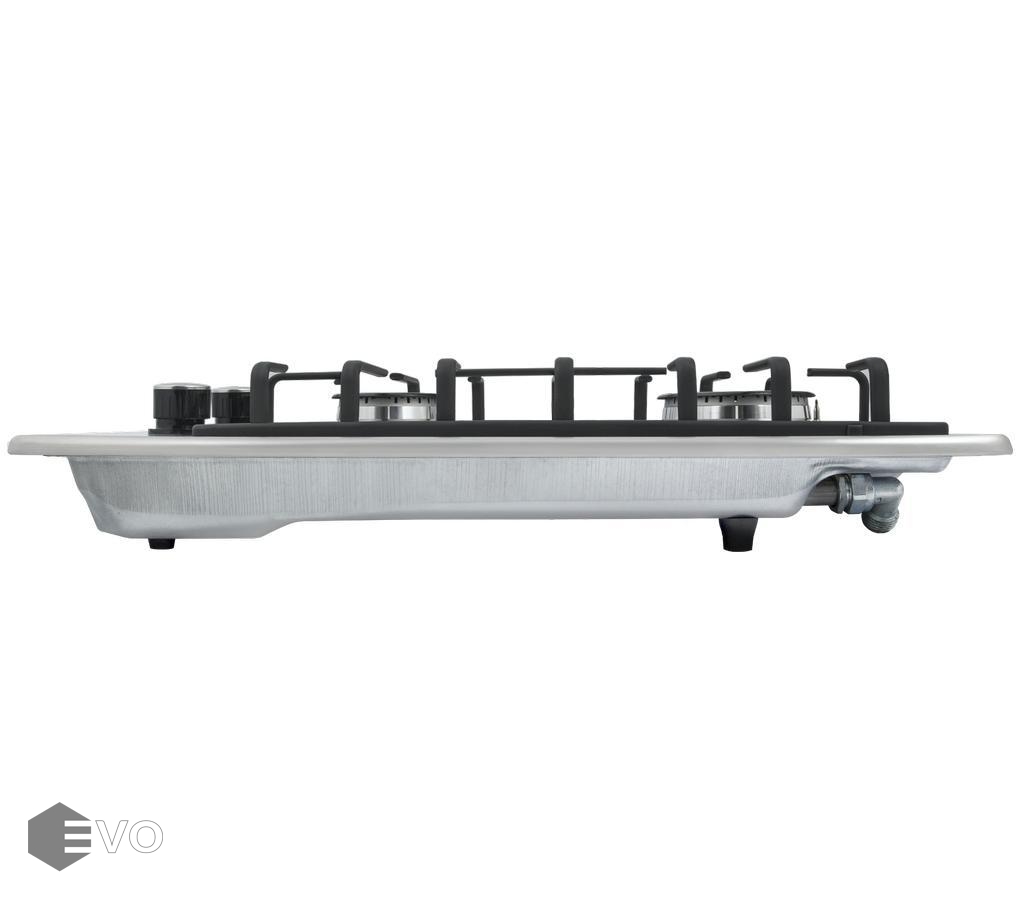Панель изготовлена из узорчатой нержавеющей стали. Модель оснащена 2 итальянскими горелками фирмы SABAF мощностью 2600 и 1700 Вт c функцией электроподжига. Над конфорками установлена матовая эмалированная решетка. Регулирование подачи газа и электоподжиг конфорок происходит с помощью поворотных ручек которые выполнены из высокопрочного термостойкого пластика.