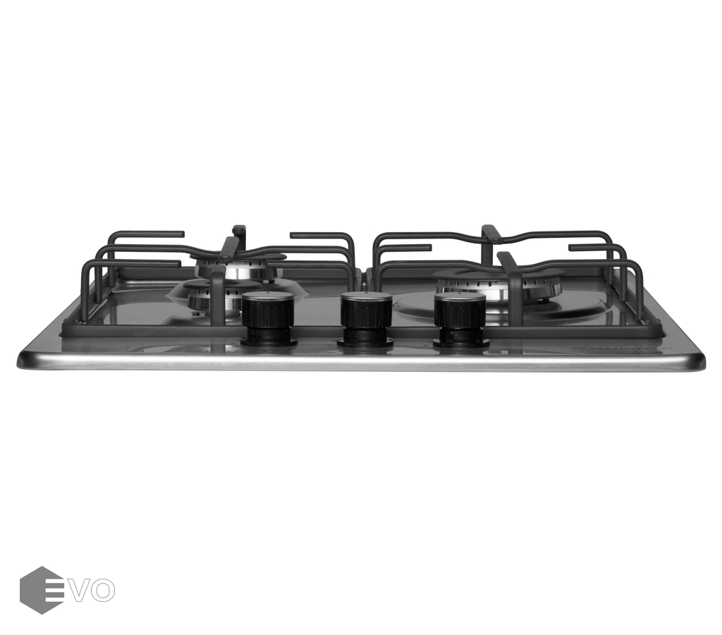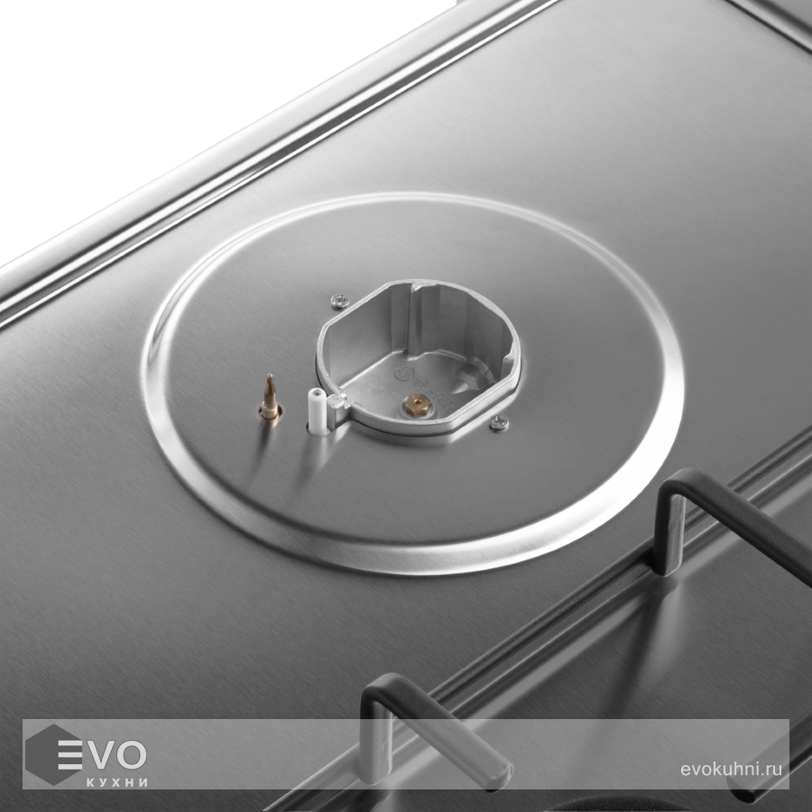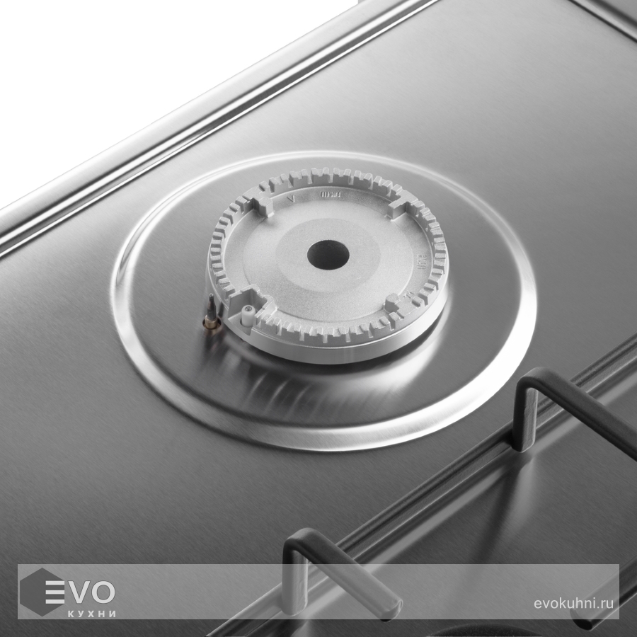 Панель выполнена из высококачественной нержавеющей стали. Укомплектована итальянскими горелками «Sabaf». Три стандартные конфорки разного диаметра с мощностью 1000 Вт, 1700 Вт и 2600 Вт. Решетки изготовлены из стали и покрыты эмалью.