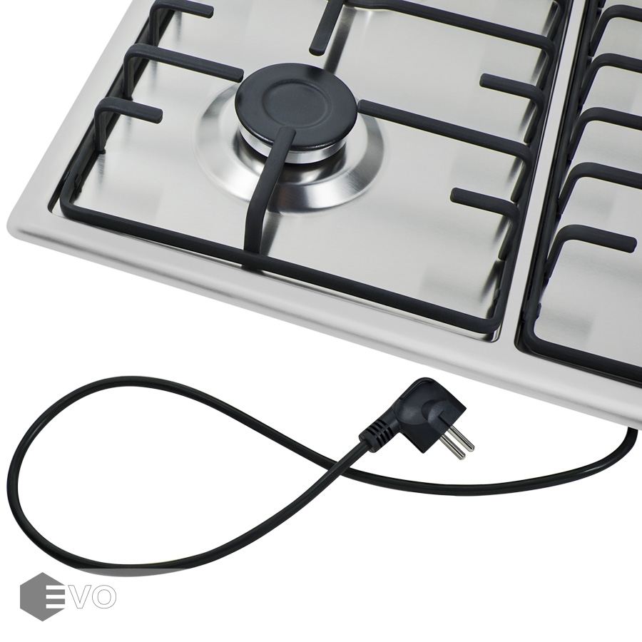 Панель выполнена из нержавеющей стали. В данной модели установлены высококачественные итальянские горелки SABAF. Четыре стандартные конфорки разного диаметра с мощностью 1000 Вт, 1700 Вт, 1700 Вт и 2600 Вт спроектированы таким образом, что огонь не перегревает ни решетки, ни ручки управления.