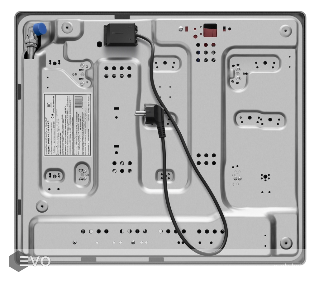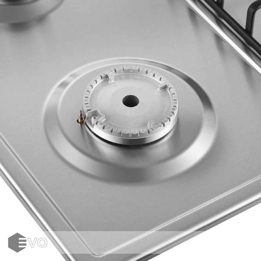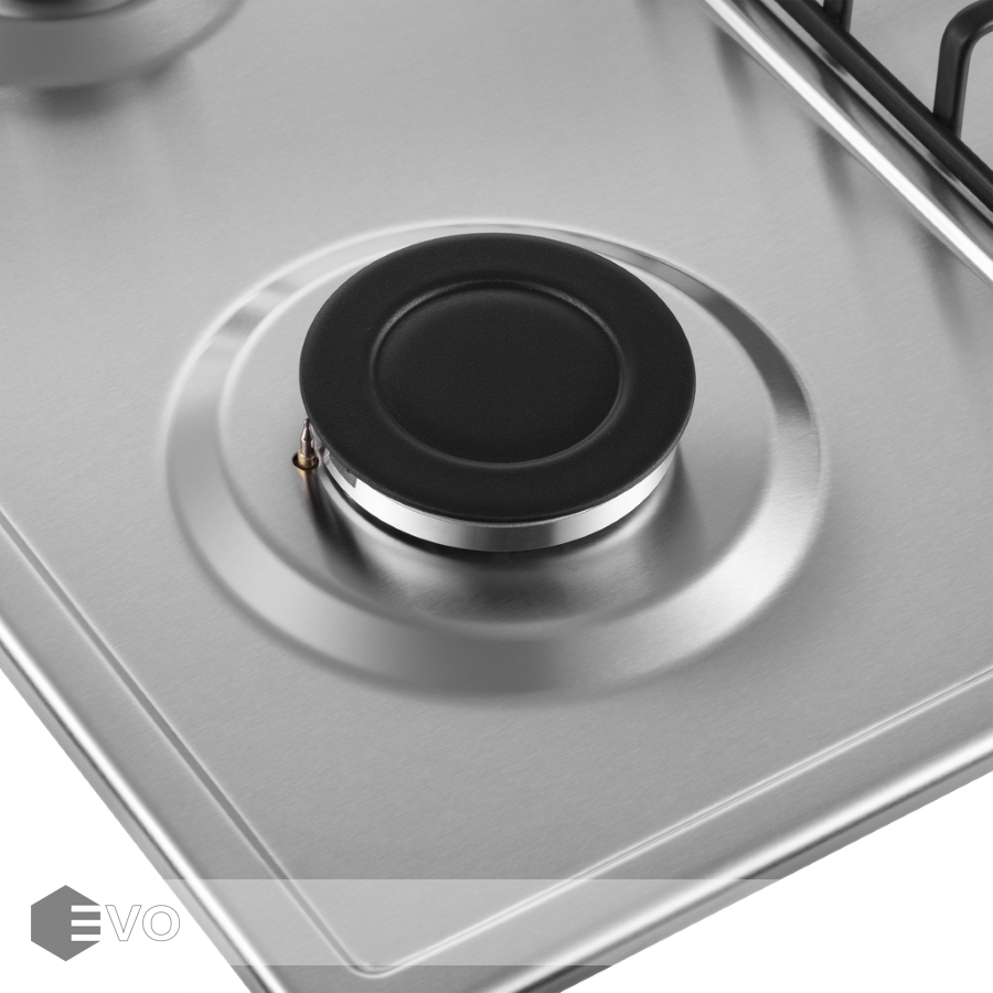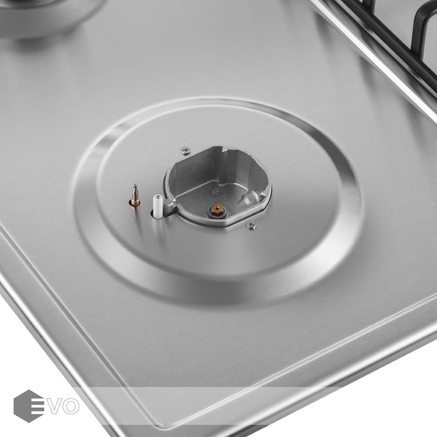 Панель выполнена из нержавеющей стали. В данной модели установлены высококачественные итальянские горелки SABAF. Четыре стандартные конфорки разного диаметра с мощностью 1000 Вт, 1700 Вт, 1700 Вт и 2600 Вт спроектированы таким образом, что огонь не перегревает ни решетки, ни ручки управления.