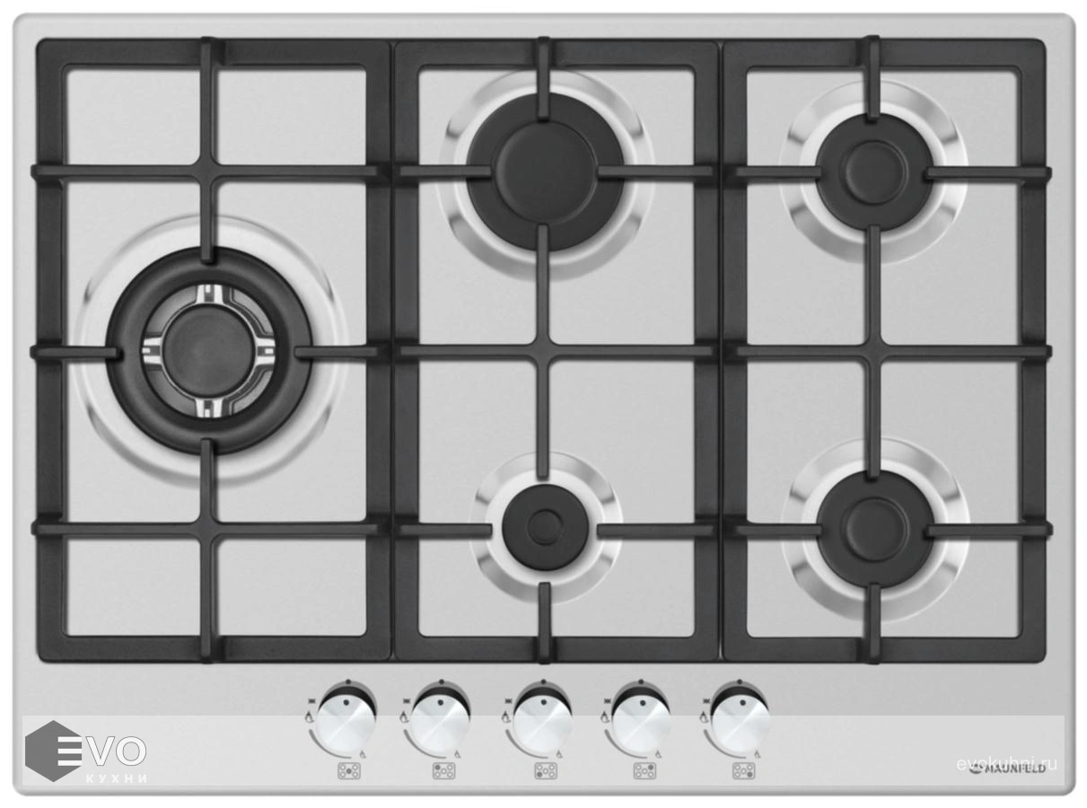 Панель выполнена из нержавеющей стали. В данной модели установлены высококачественные итальянские горелки SABAF.  Четыре стандартные конфорки  разного диаметра мощностью 1000 Вт, 1700 Вт, 1700 Вт, 2600 Вт и 1 сверхмощная WOK-конфорка с двойным пламенем мощностью 3800 Вт, расположенная на левой части панели.
