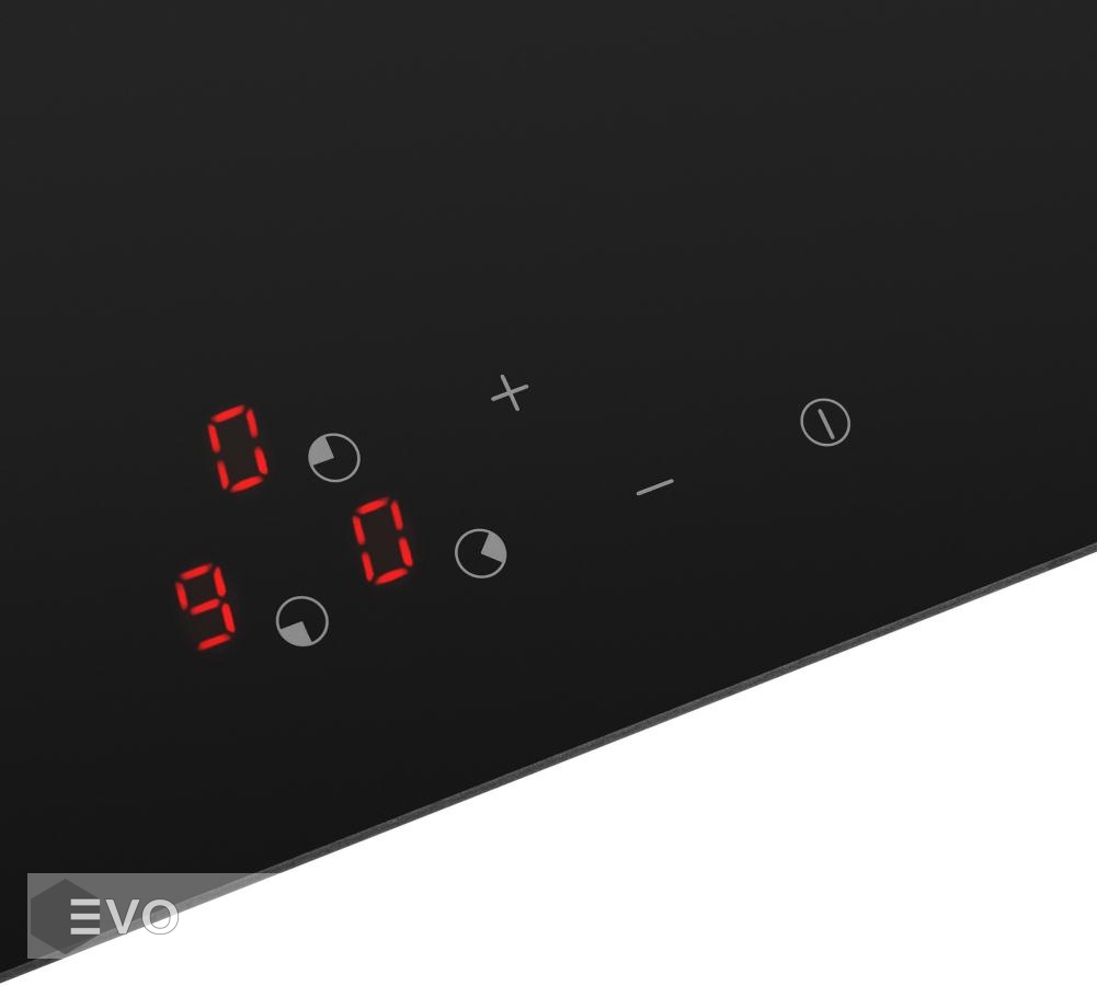 Сенсорное управление с красной индикацией находится на фронтальной поверхности и дает возможность: выбрать уровень мощности для каждой конфорки (от 0 до 9), выставить таймер (от 0 до 99 минут) для отключения одной или нескольких варочных зон по истечении заданного времени, заблокировать панель от детей, включить режим автоматического приготовления пищи.
