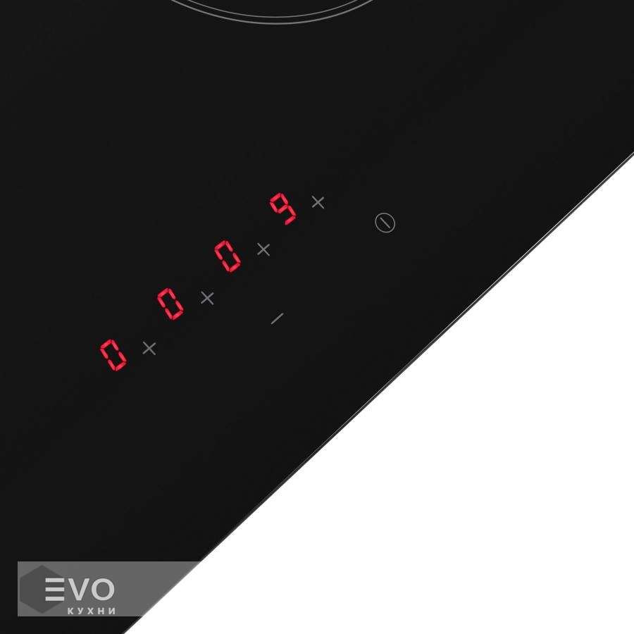 Сенсорное управление с красной индикацией находится на фронтальной поверхности и дает возможность: выбрать уровень мощности для каждой конфорки (от 0 до 9), выставить таймер (от 0 до 99 минут) для отключения одной или нескольких варочных зон по истечении заданного времени, заблокировать панель от детей, включить режим автоматического приготовления пищи.