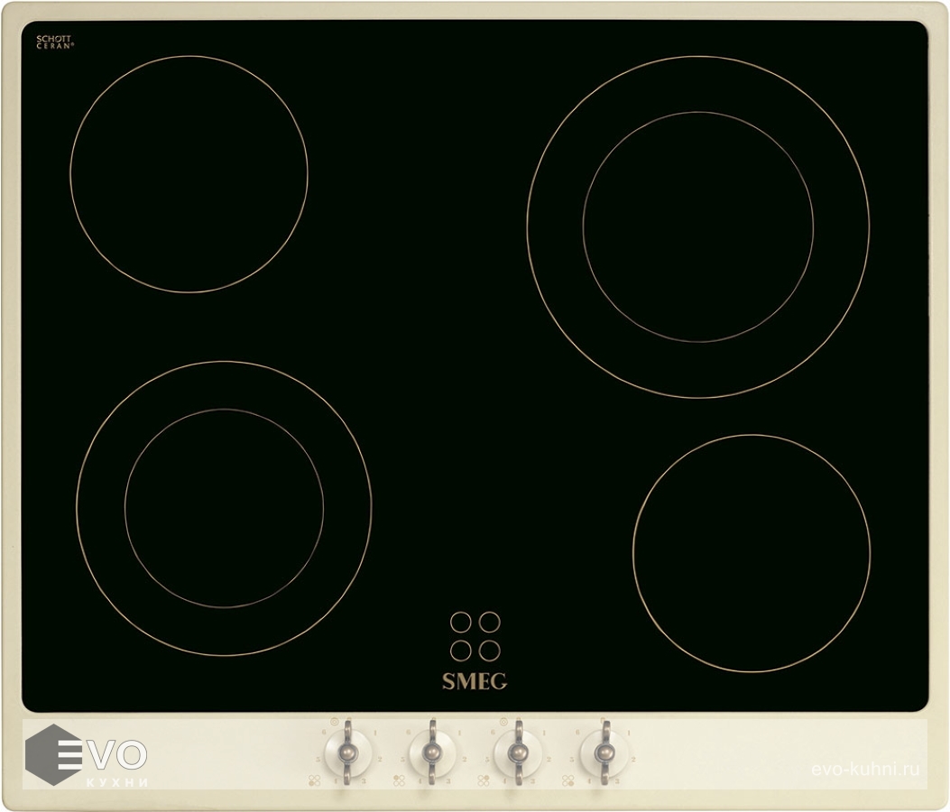 Электрическая варочная панель SMEG P864PO — панель в стиле ретро, выполнена из черной стеклокерамики, выбор режимов регулируется поворотными переключателями, выбор интенсивности нагрева производится по 6 ступеням. Индикация остаточного тепла информирует, что температура конфорки выше 60°C и ее можно использовать для подогрева готовых блюд, или для растапливания масла, шоколада.