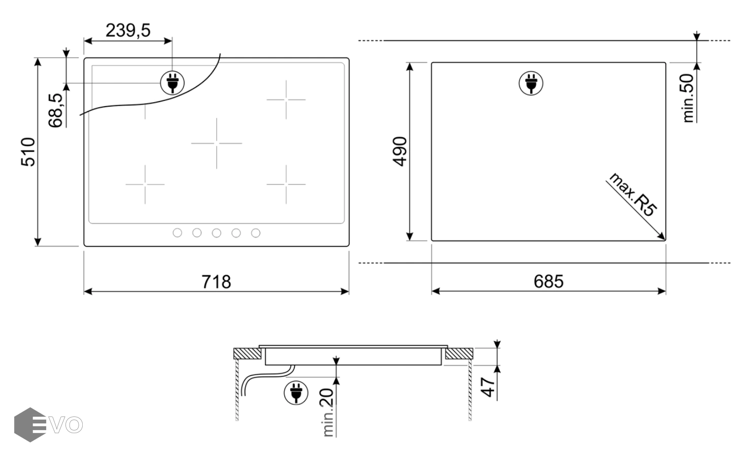 - Правая дальняя конфорка, диаметр/кВт: 210/2,4