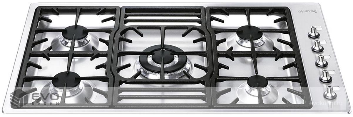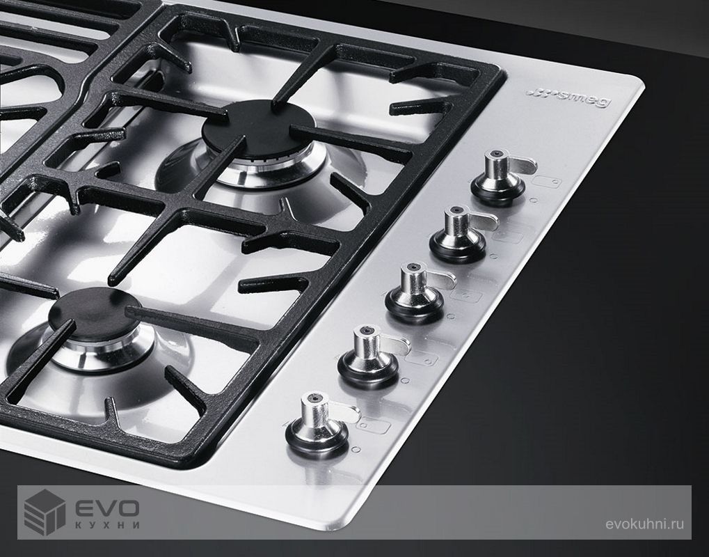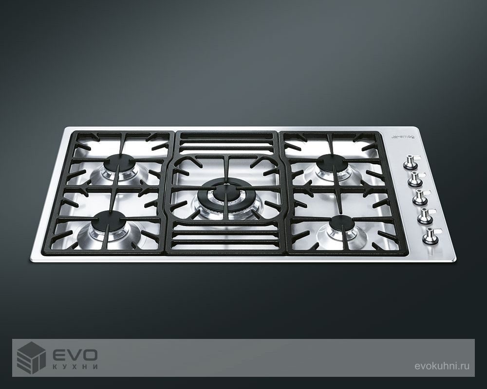 Газовая варочная панель SMEG PGF95-4 – газовая варочная поверхность из нержавеющей стали предназначена для домашнего применения (приготовление и нагрев блюд). Установка возможна на различные жаростойкие материалы. Имеет пять конфорок с функцией автоматического электроподжига: 3 средние, 1 малая, 1 WOK. Управление осуществляется при помощи поворотных регуляторов.