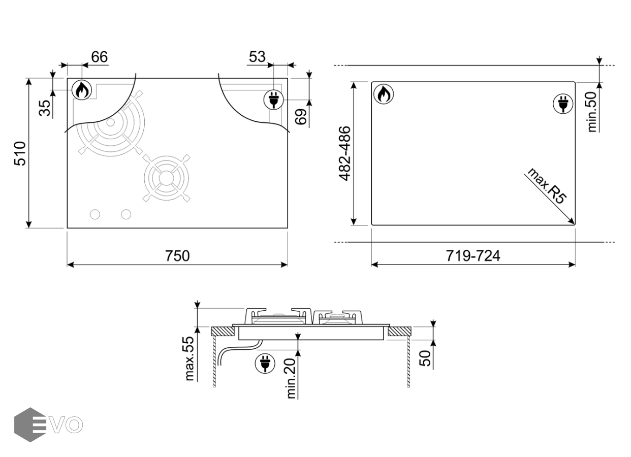 Две газовые конфорки с функцией автоматического электроподжига, а также функцией «Газ-контроль»: 1 большая, 1 малая, управление осуществляется при помощи поворотных регуляторов. Две индукционные варочные зоны с функцией BOOSTER и одной Multizone, их расположение ясно показано продольными линиями, а тепло ограничено начерченным на стекле периметром.