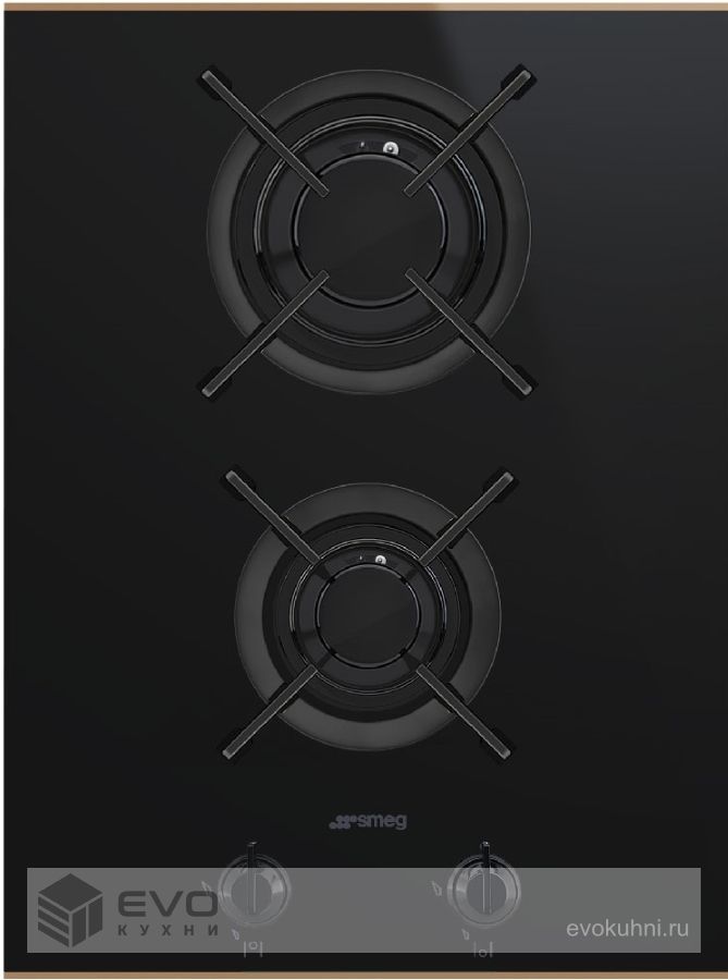 Газовая варочная панель SMEG PV632CNR – газовая варочная поверхность из закаленного стекла, имеет медную рамку и предназначена для домашнего применения (приготовление и нагрев блюд). Установка возможна на различные жаростойкие материалы. Имеет две конфорки с функцией автоматического электроподжига.  Отличительной особенностью является наличие предохранительного устройства – если конфорки случайно погаснут, то через 20 сек. даже при открытом кране прекратится подача газа. Решетка изготовлена из чугуна, крышка горелки эмалированная.