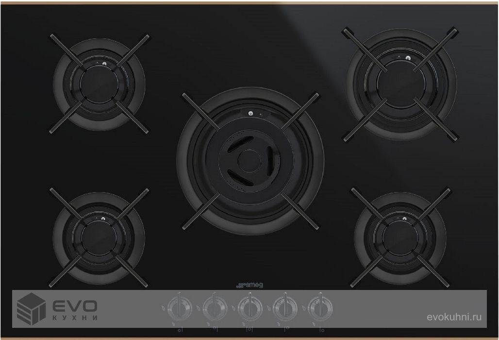 Газовая варочная панель SMEG PV675CNR – газовая варочная поверхность из закаленного стекла имеет рамку медного цвета и предназначена для домашнего применения (приготовление и нагрев блюд). Установка возможна на различные жаростойкие материалы. Имеет пять конфорок с функцией автоматического электроподжига: 2 маленькие, 1 большая, 1 средняя, 1 WOK. Управление осуществляется при помощи поворотных регуляторов.