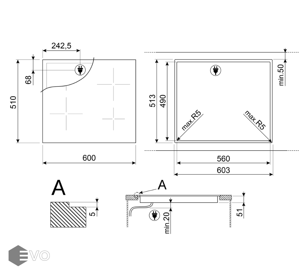 • Передняя правая конфорка, диаметр мм/кВт: 165/1,2