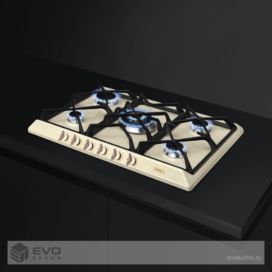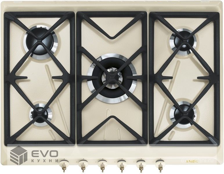 Газовая варочная панель SMEG SRV876POGH – газовая варочная поверхность из эмалированной стали предназначена для домашнего применения (приготовление и нагрев блюд). Установка возможна на различные жаростойкие материалы. Имеет пять конфорок с функцией автоматического электроподжига: 1 маленькая, 2 средние, 1 большая, 1 WOK. Управление осуществляется при помощи поворотных регуляторов.