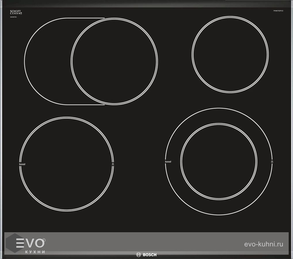 Функции: Таймер конфорок Блокировка панели управления Защитное отключение конфорок Индикатор остаточного тепла Контурная конфорка Овальная зона нагрева