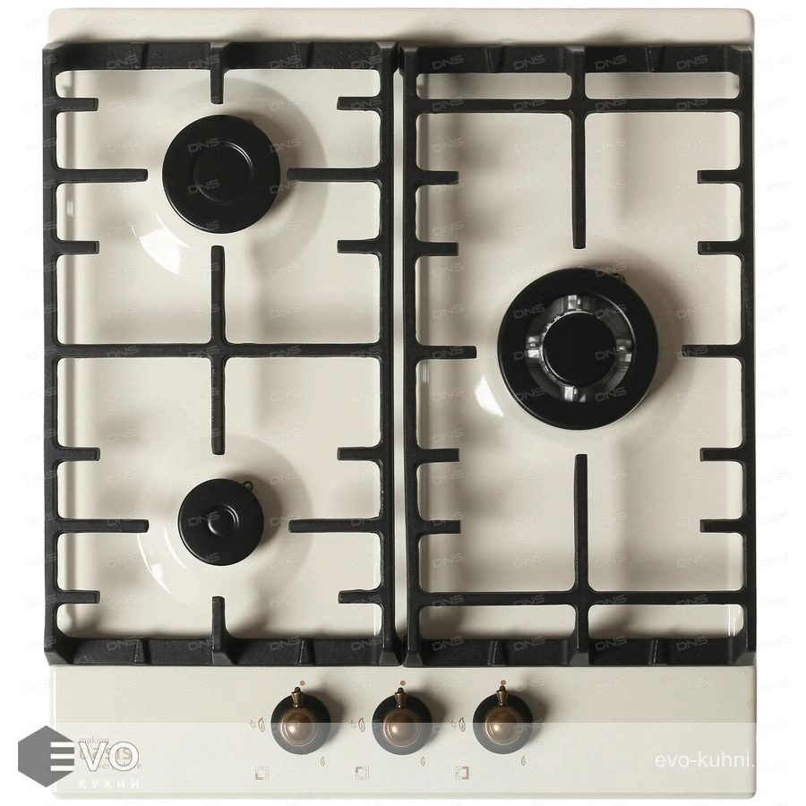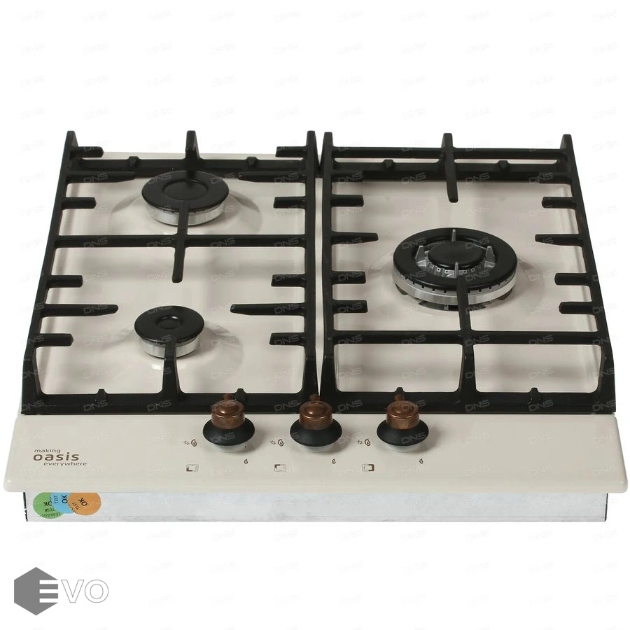 Газовая варочная поверхность Oasis P-3MRT с эмалированной бежевой панелью оснащена устойчивыми чугунными решетками.