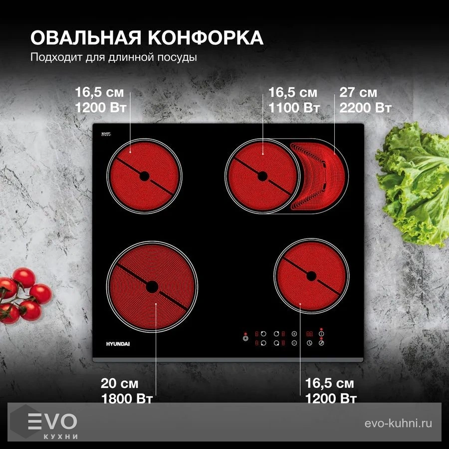 - Правая дальняя конфорка мощность 1100/2000 Вт размер165/270 мм