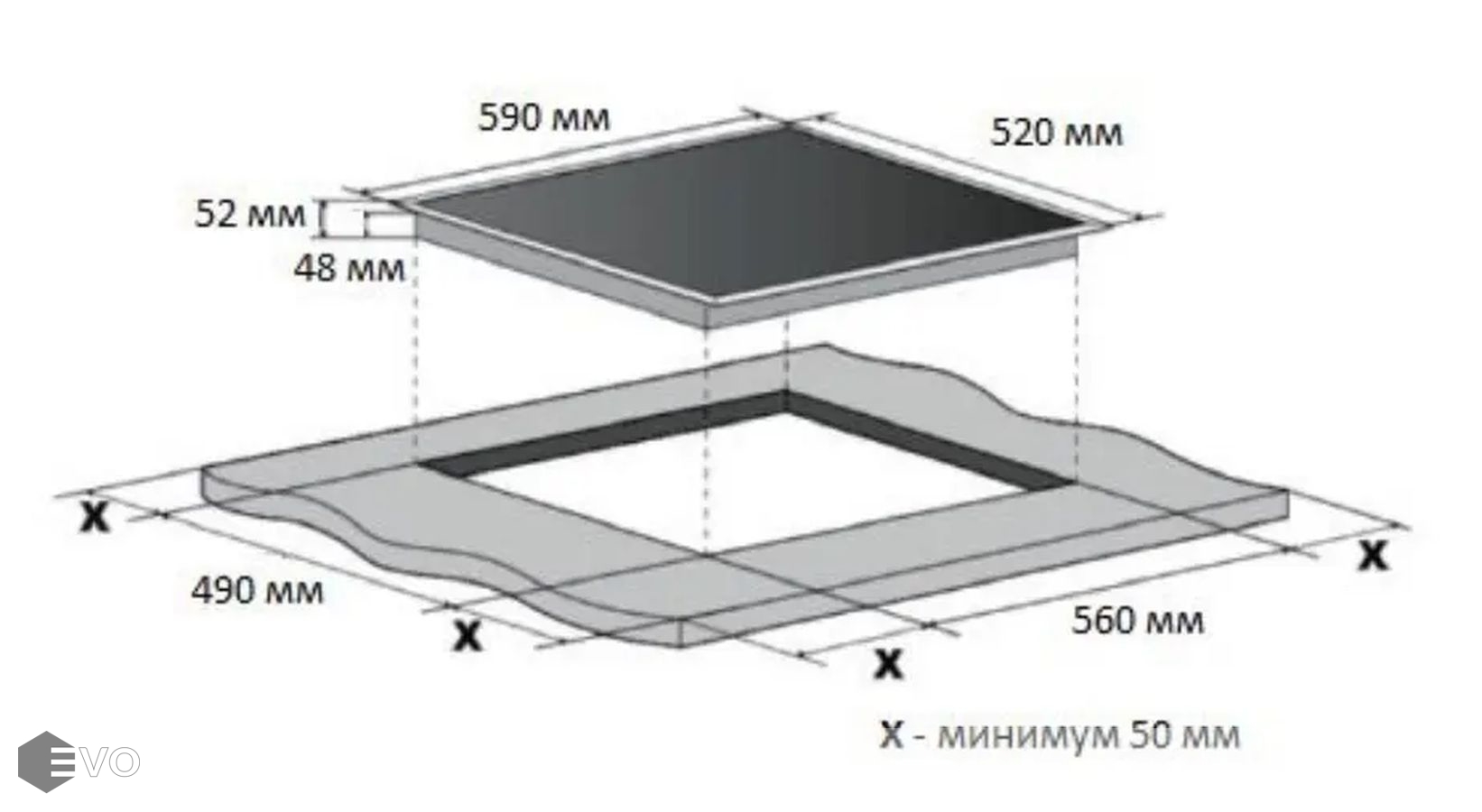 Размеры встраивания (ВхШхГ), мм: | 52х560х490 мм |