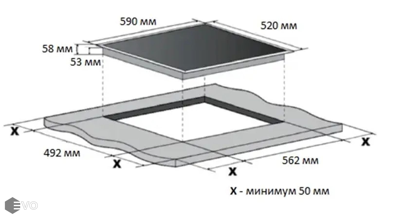 - Размеры ниши для встраивания (ШхВxГ) 562x52,5х492 мм