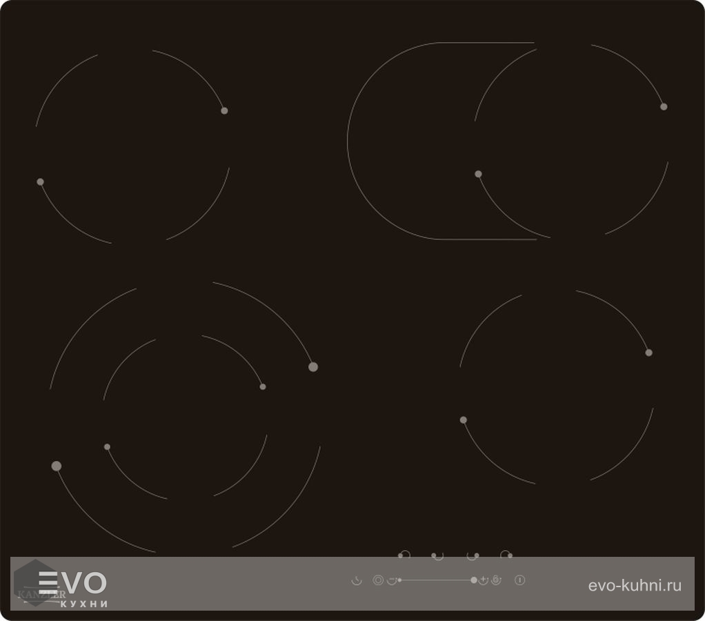 - Нагревательные элементы HiLight: расширенный двойной, 1х1.1/2.2 кВт (передний левый), диаметр 230 мм; расширенный овальный, 1х1.1/2 кВт (задний правый), диаметр 270 мм; 2х1.2 кВт (передний правый и задний левый), диаметр 165 мм