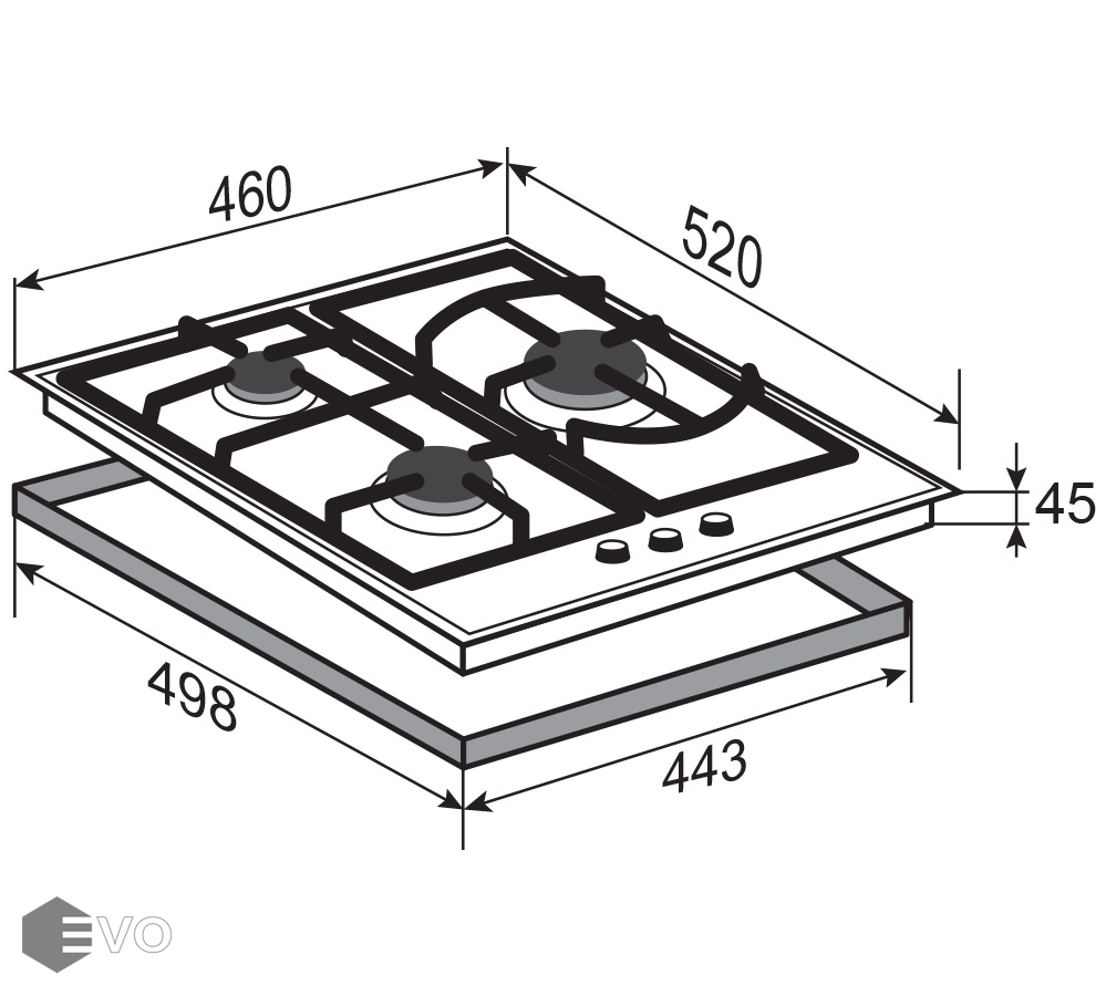 Встраиваемая газовая варочная панель с 3 конфорками. Две чугунные решетки. Переключатели с электроподжигом. WOK-горелка мощностью 3800 Вт. Каждая конфорка оснащена устройством контроля наличия пламени (газконтроль), которое останавливает подачу газа в случае исчезновения пламени.