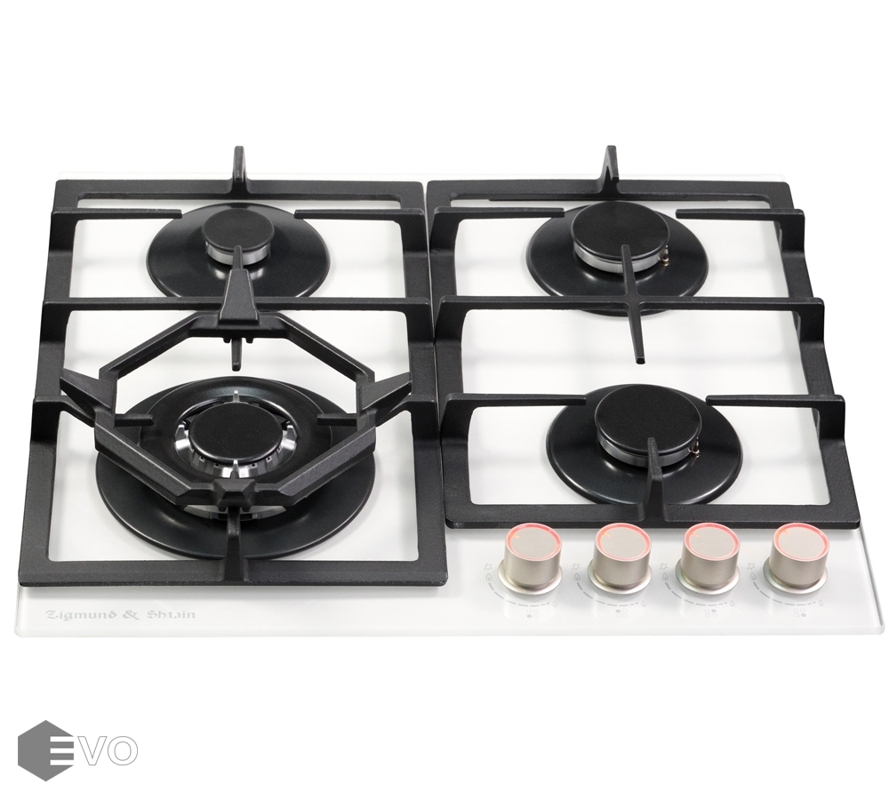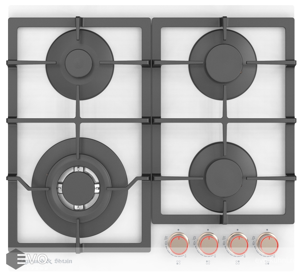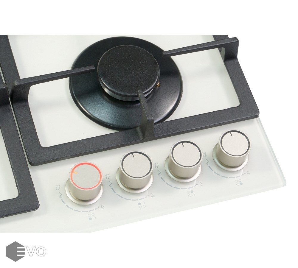 Встраиваемая газовая варочная панель с 4 конфорками. Две чугунные решетки. Переключатели с электроподжигом. WOK-горелка мощностью 3800 Вт. Каждая конфорка оснащена устройством контроля наличия пламени (газконтроль), которое останавливает подачу газа в случае исчезновения пламени.