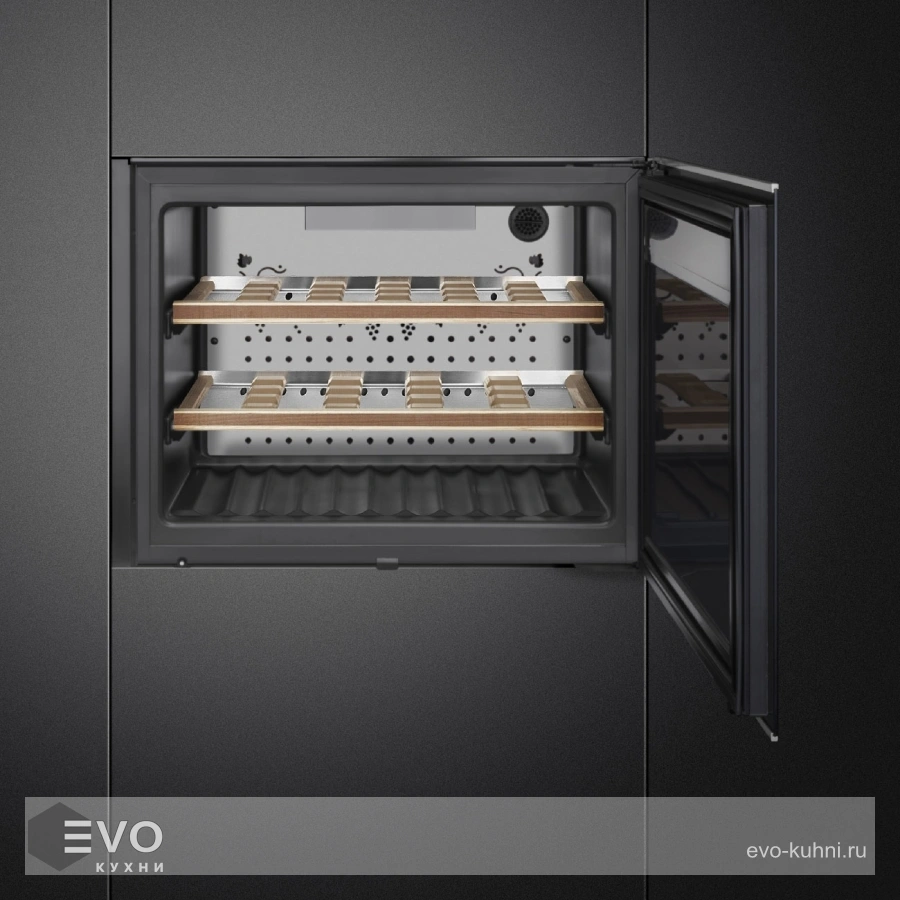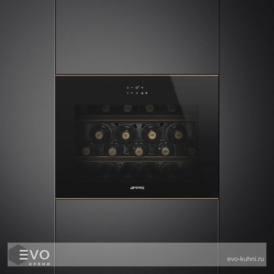 Винный шкаф Smeg CVI621RWNR3 – винный холодильник оснащен элегантным черным стеклом, профилированным из меди, вместимостью до 21 бутылок вина. Интуитивно понятный цифровой сенсорный дисплей управления, размещенный на внешнем стекле позволяет получить доступ к элементам управления, таким как температура, влажность и освещение не открывая дверцы. Тем самым избегая влияния на внутреннею температуру камеры, сводя к минимуму вибрации которым подвергается вино.