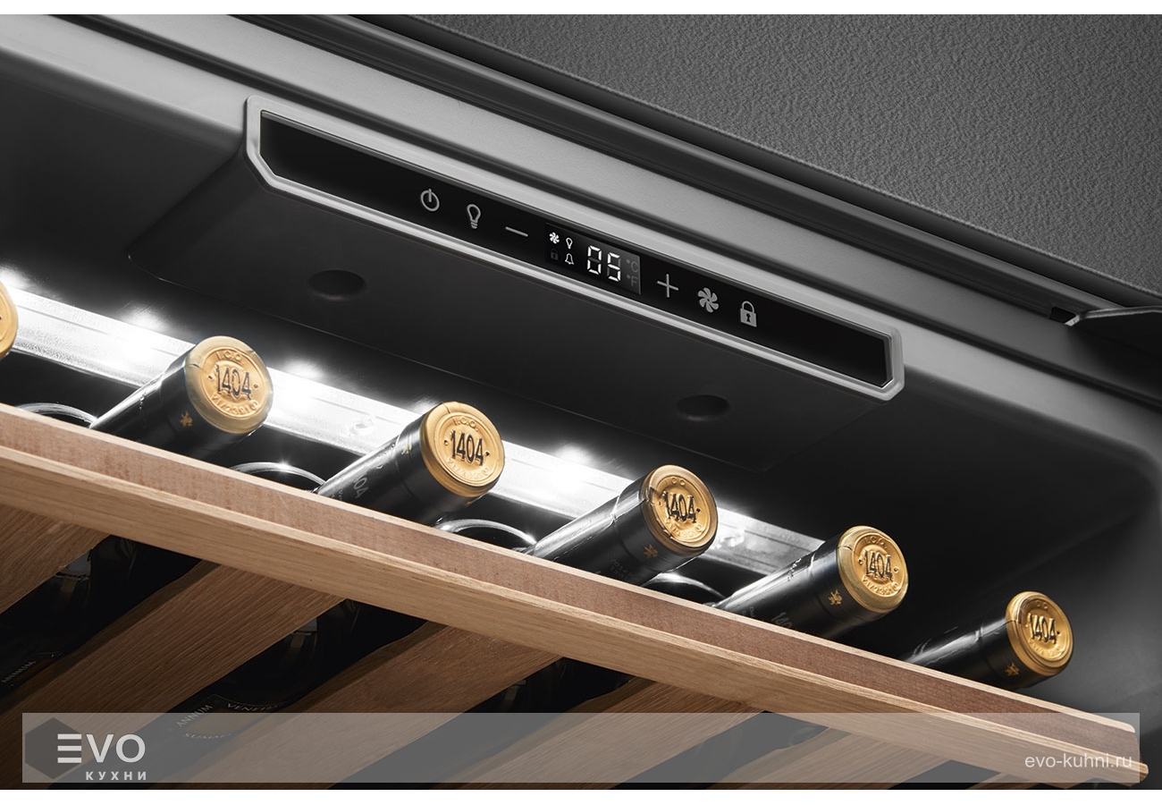 Модель с дверным упором справа открывается одним нажатием. Полностью стеклянную дверцу с УФ-защитой можно перенавесить. Мульти температурный шкаф позволяет подготовить к подаче белые, красные и розовые вина. Полки из натурального дерева рассчитаны на хранение до 21 бутылки объемом 0,75 литров.