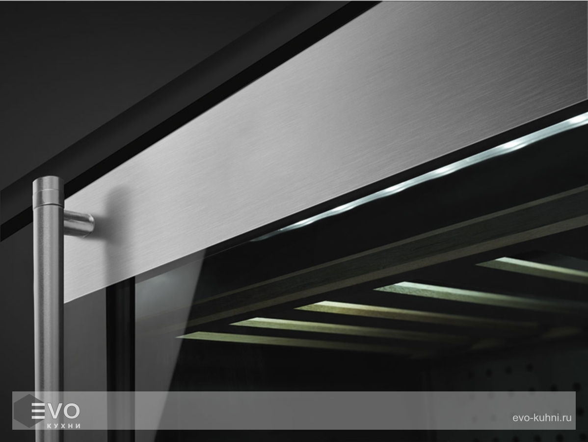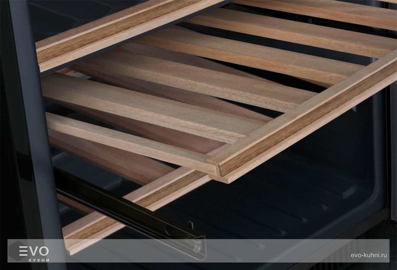 Камера оснащена пятью полками из дерева, которые считаются более прочными и долговечными по сравнению с другими материалами. Дверца полностью сделана из стекла, которое не пропускает УФ-лучи, что благотворно сказывается на сроке хранения вина.
