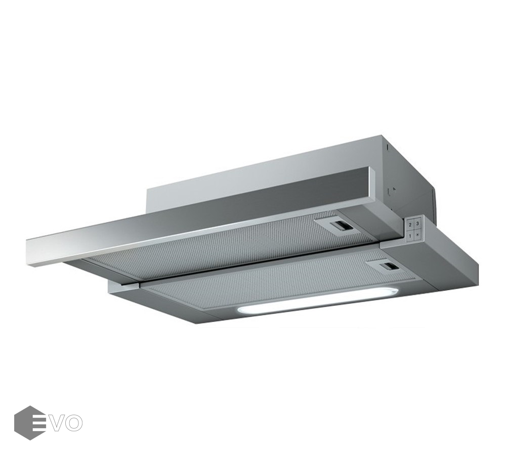 Прибор включается путем выдвижения передней панели. Простые кнопочные переключатели гарантируют удобное управление тремя скоростями вытяжки и включением/выключением освещения. Алюминиевый фильтр пригоден для мытья в посудомоечной машине. Модель может работать в режимах отвода и рециркуляции (угольный фильтр для работы в режиме рециркуляции должен быть приобретен отдельно). Две яркие лампы станут полноценным источником освещения рабочей поверхности.