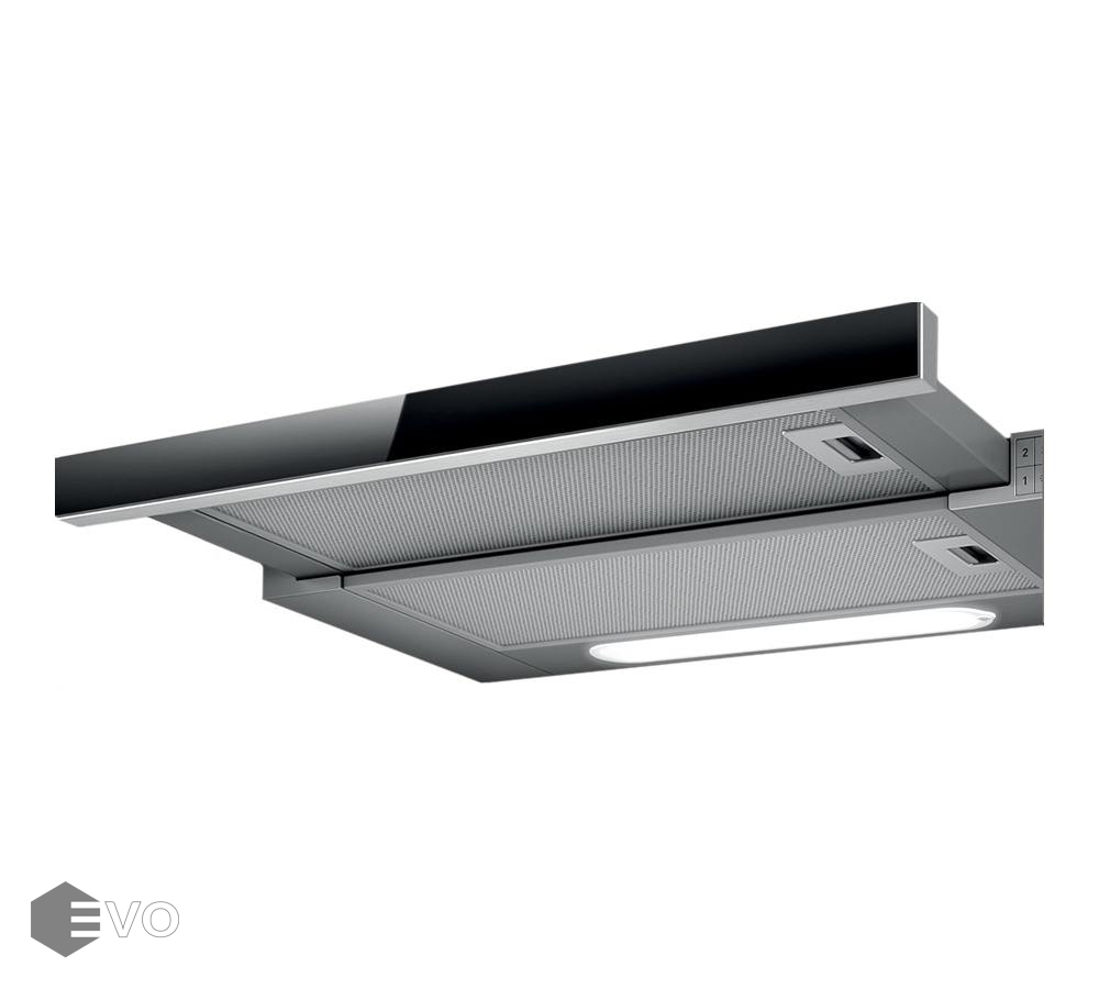 Прибор включается путем выдвижения передней панели. Простые кнопочные переключатели гарантируют удобное управление тремя скоростями вытяжки и включением/выключением освещения. Алюминиевый фильтр пригоден для мытья в посудомоечной машине. Модель может работать в режимах отвода и рециркуляции (угольный фильтр для работы в режиме рециркуляции должен быть приобретен отдельно). Две яркие лампы станут полноценным источником освещения рабочей поверхности.