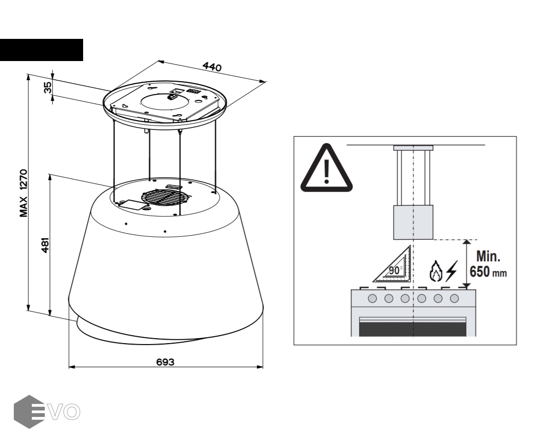 - Высота установки над электрическими варочными поверхностями, мм: 650