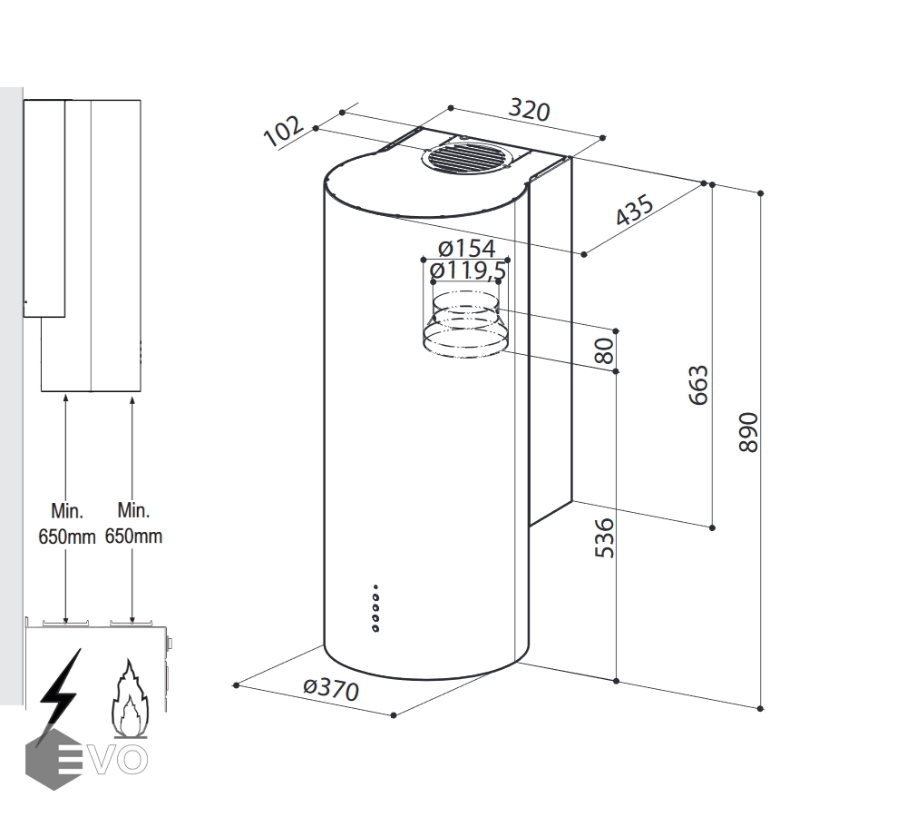- Высота установки над электрическими варочными поверхностями, мм: 650