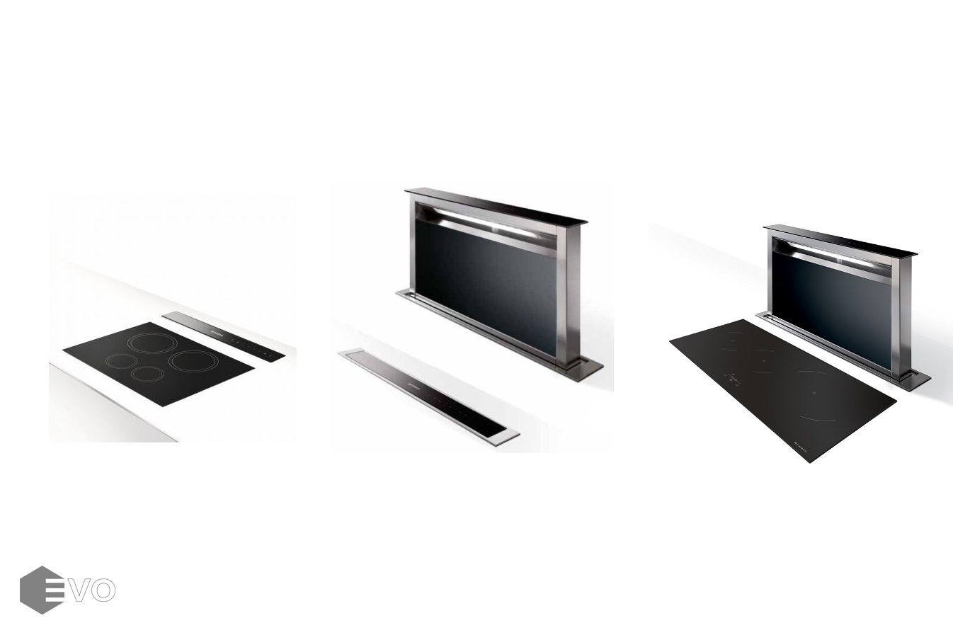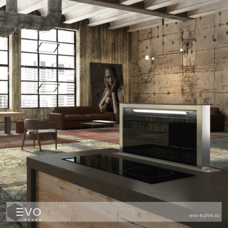 Корпус, мотор и другие элементы вытяжки Fabula скрыты под столешницей. Когда модель не работает, на поверхности видно только узкую полоску стекла с сенсорным управлением, которая выглядит продолжением варочной поверхности. При включении, с помощью скрытых моторов, панель поднимается вертикально вверх, появляется рабочая поверхность и включается светодиодная подсветка, образуя уютный и невероятно функциональный угол.