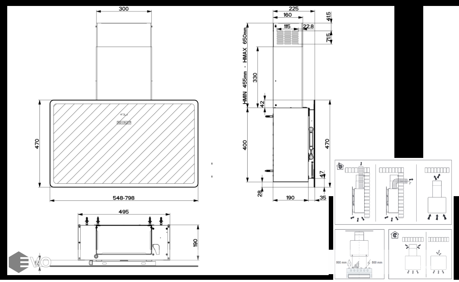 • Высота установки над электрическими варочными поверхностями, мм: 500