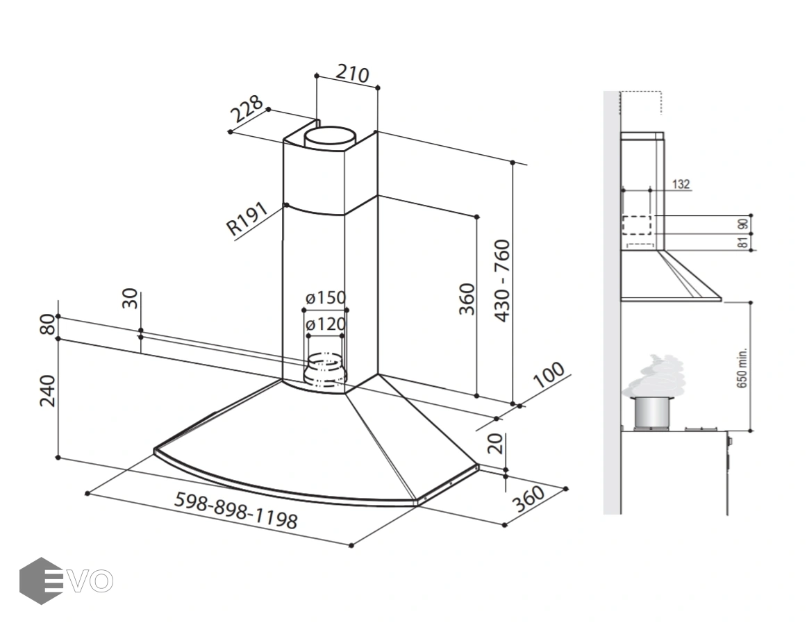 - Высота установки над электрическими варочными поверхностями, мм: 650