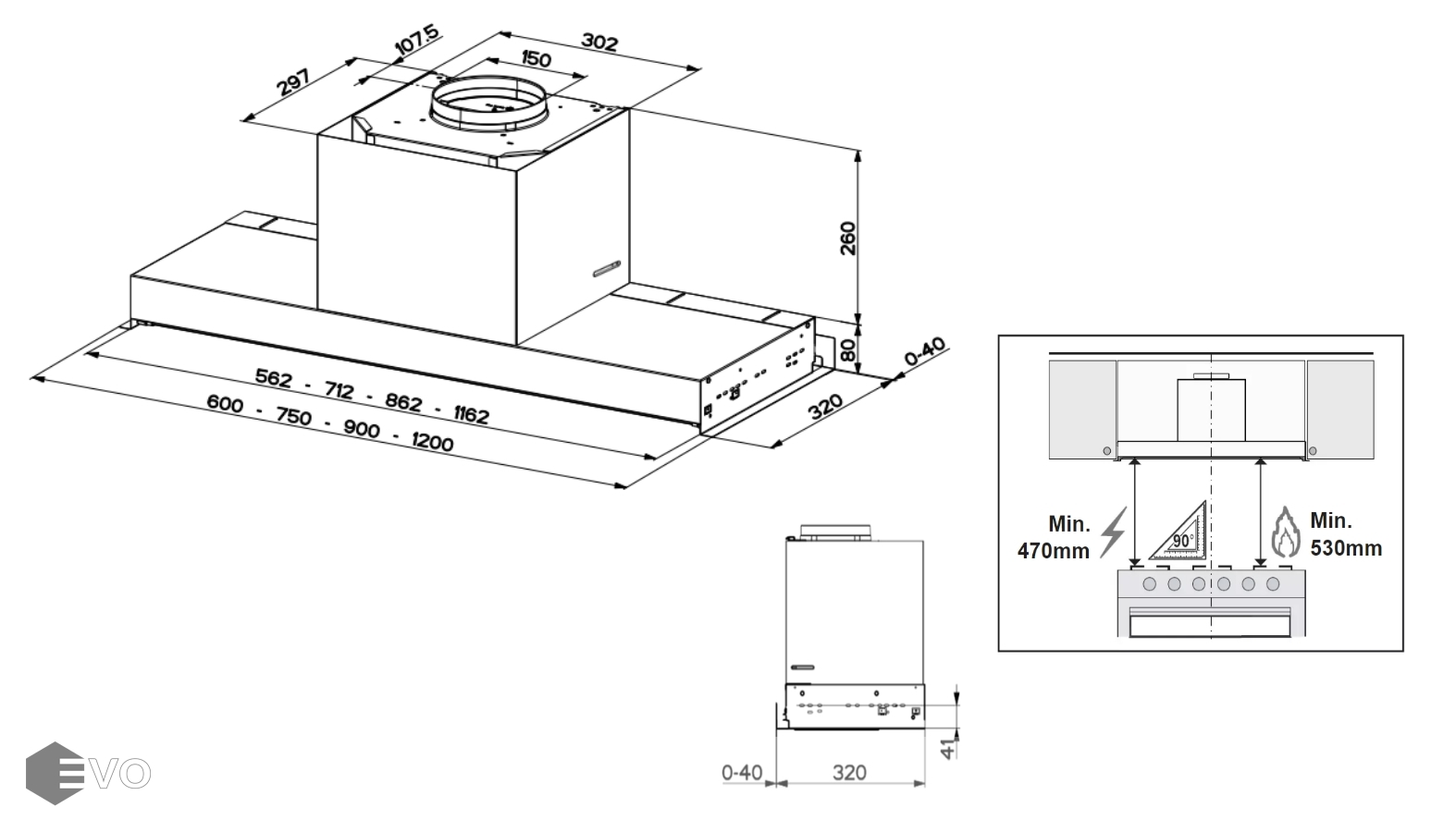 • Высота установки над электрическими варочными поверхностями, мм: 470