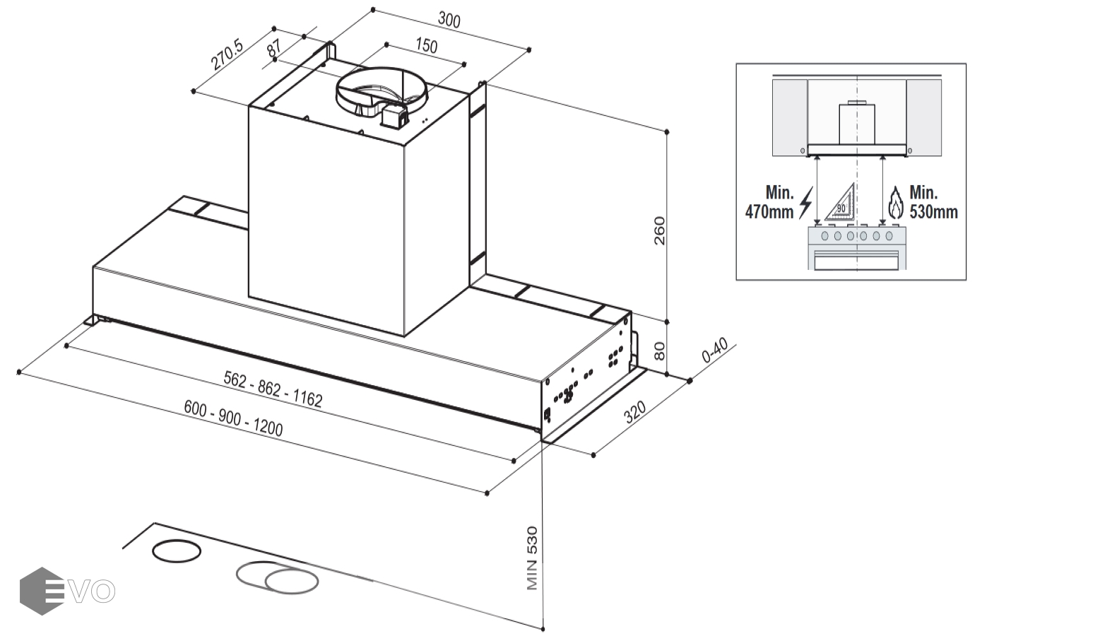 • Высота установки над электрическими варочными поверхностями, мм: 470