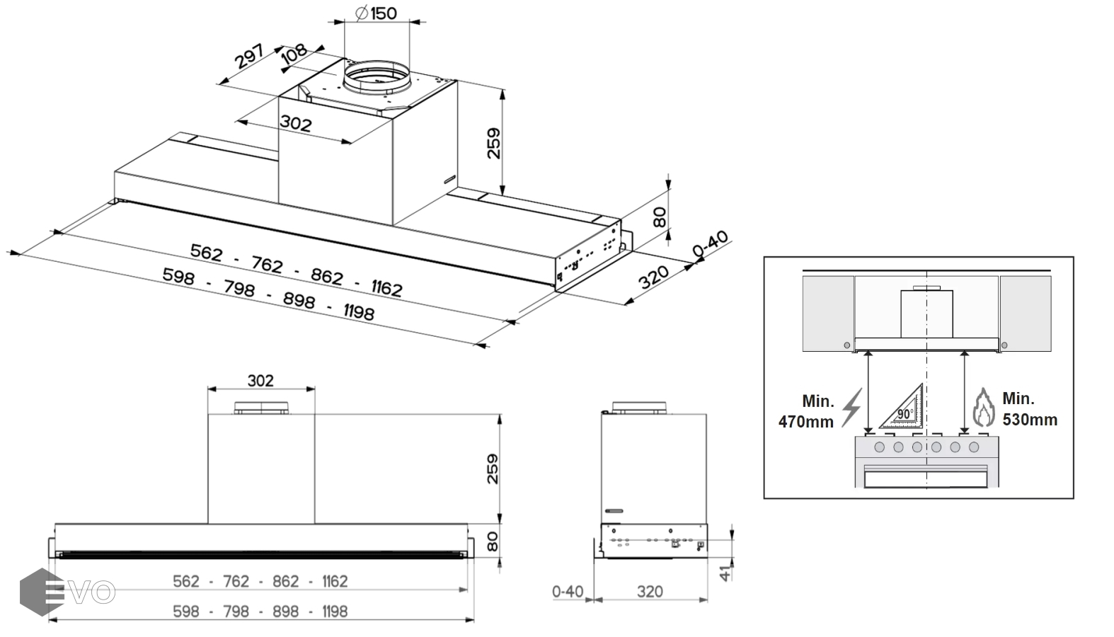 - Высота установки над электрическими варочными поверхностями, мм: 470