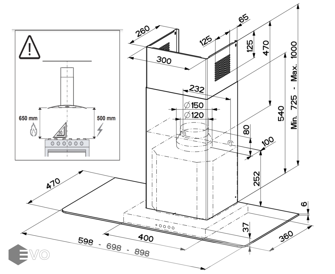 - Высота установки над газовыми варочными поверхностями, мм: 650