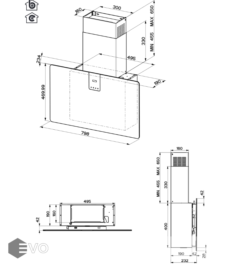 • Высота установки над электрическими варочными поверхностями, мм: 650