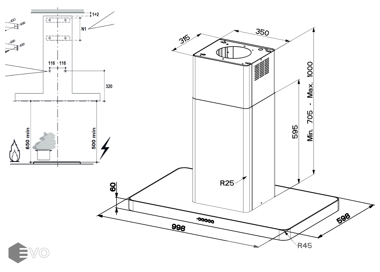 - Высота установки над электрическими варочными поверхностями, мм: 500