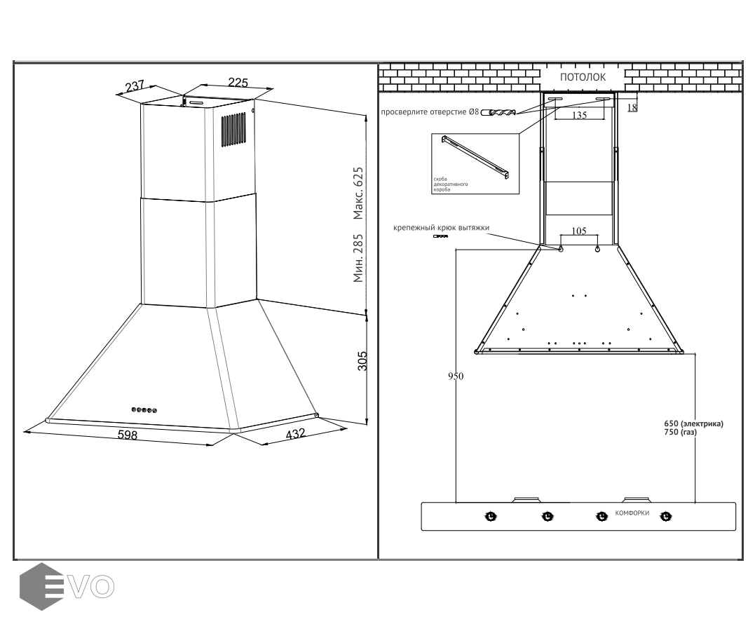 - Высота установки над электрическими варочными поверхностями, мм: 650