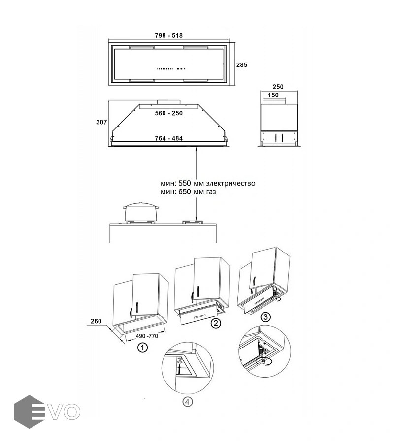 - Высота установки над электрическими варочными поверхностями, мм: 550