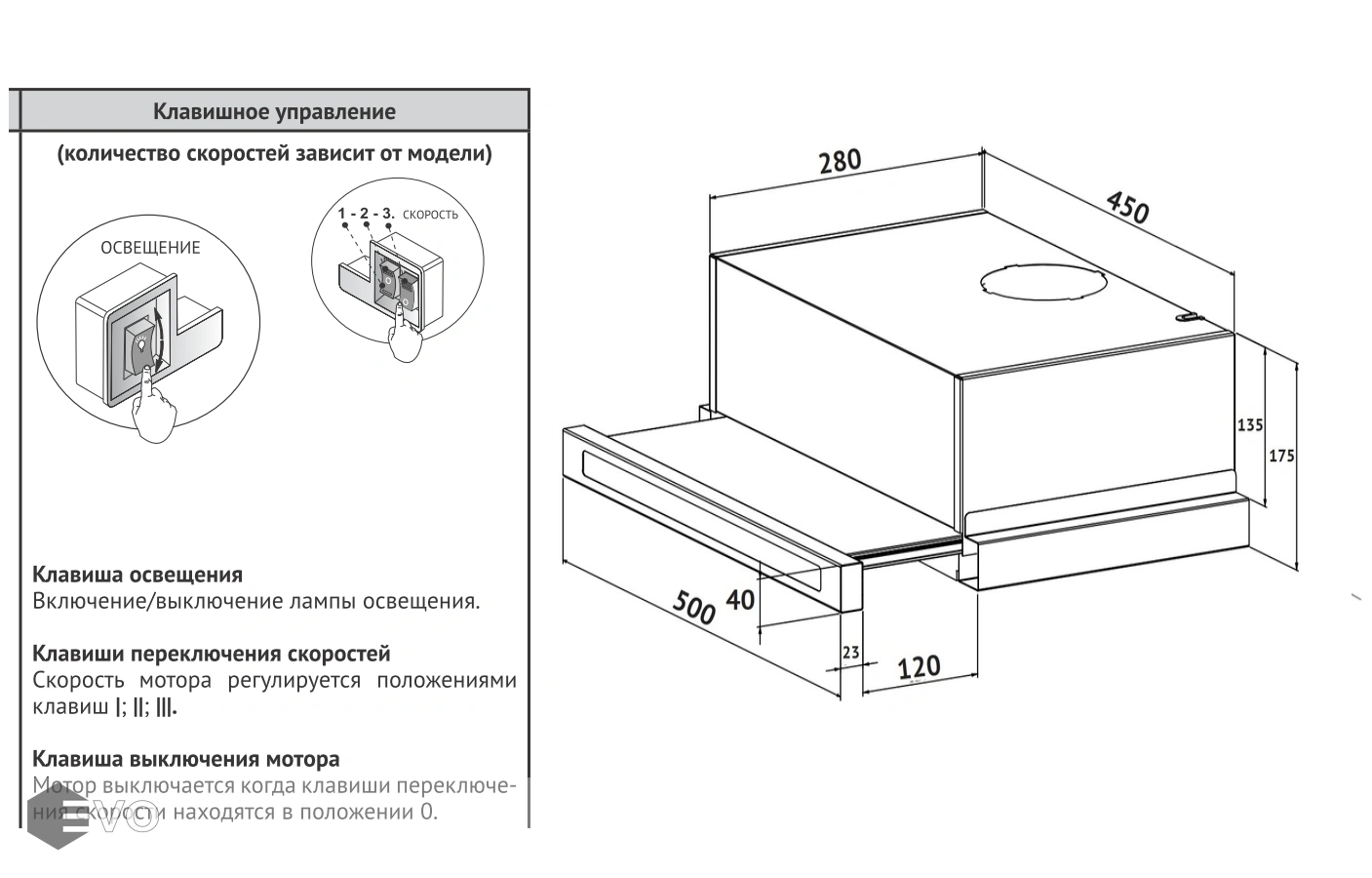 | Особенности вытяжки: | Выдвижная панель Жировой фильтр |