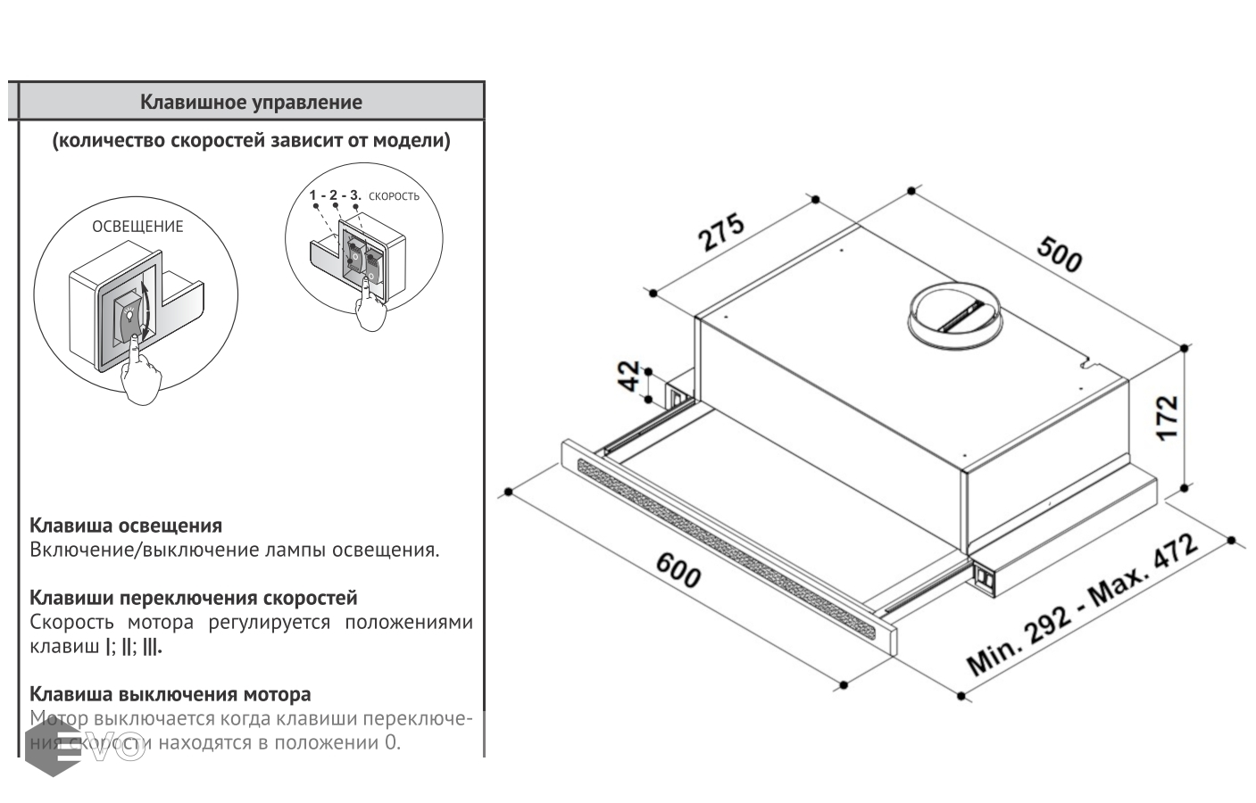 Особенности вытяжки: Выдвижная панель Жировой фильтр
