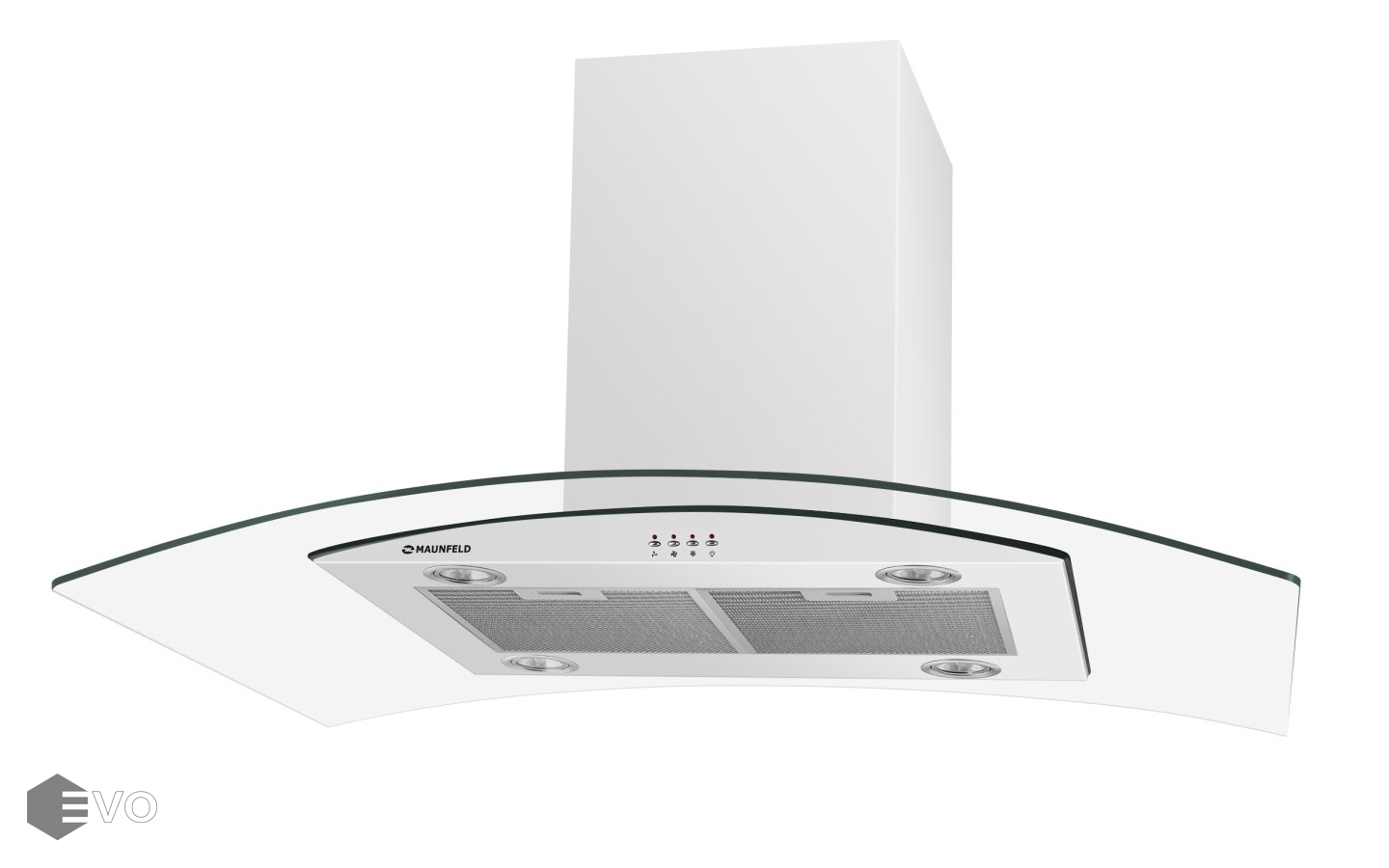 Островная вытяжка MAUNFELD Ancona PlusA Isla 90 белый\прозрачное стекло – вытяжка шириной 90 см представлена в белом металлическом корпусе с отделкой из прозрачного изогнутого стекла. Может работать в двух режимах: прямой отвод в вентиляционное отверстие или использование сменного угольного фильтра. Кнопочное управление, расположенное на панели освещения, позволяет выбрать одну из 3-х скоростей работы вентилятора и включить освещение.