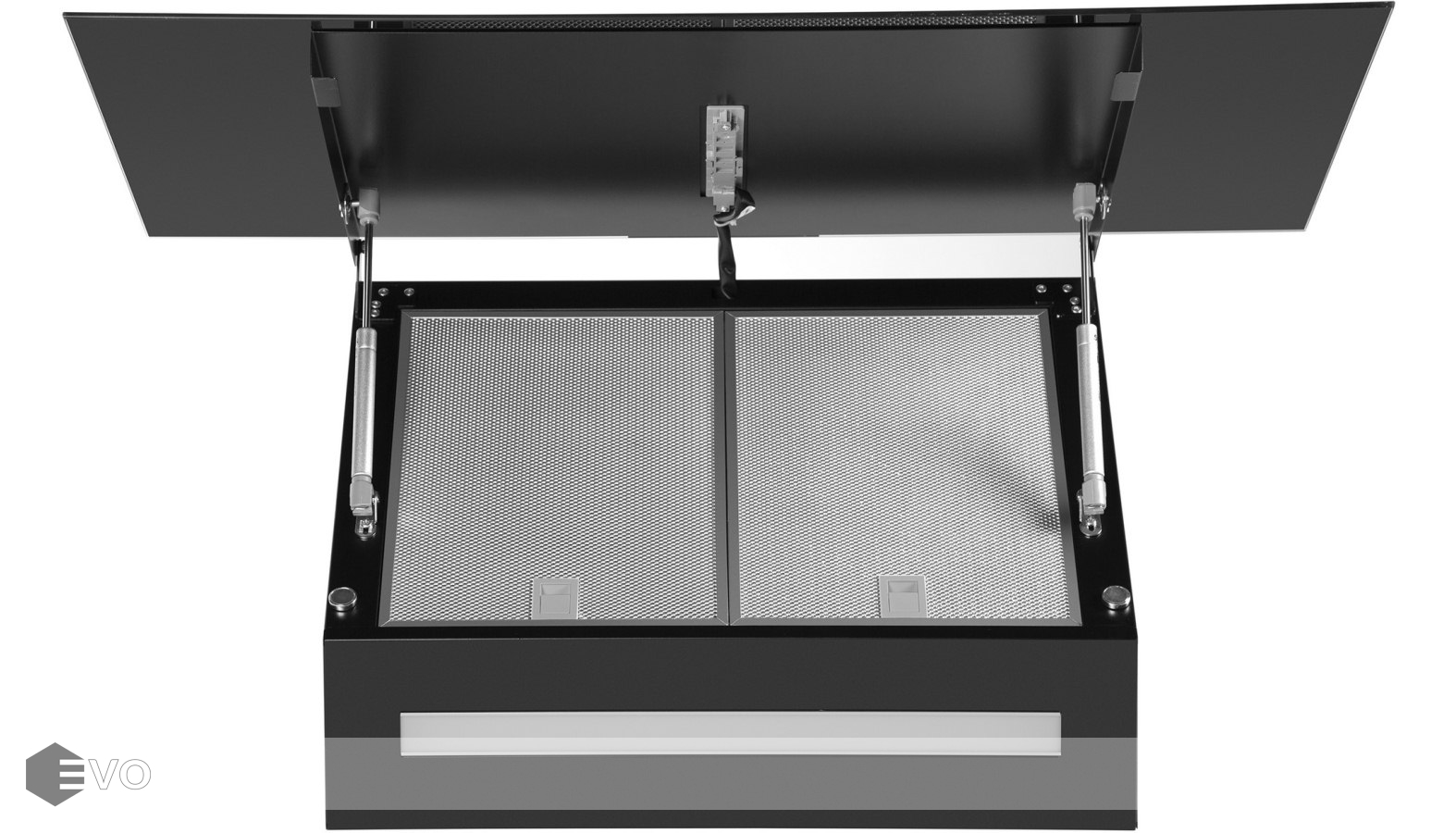 Корпус сделан из нержавеющей стали. Загрязненный воздух поступает в вытяжку через открывающуюся панель из матового закаленного белого стекла. За ней скрыт многослойный жироулавливающий фильтр, который легко снимается и полностью разбирается, что сильно упрощает чистку. Сенсорное управление с дисплеем находится на центральной части фасада. Можно включить: одну из 3-х скоростей, таймер, светодиодную лампу мощностью 8 Вт.