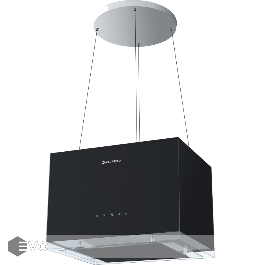 Островная вытяжка MAUNFELD Box Rope Isla 50 черный – подвесная вытяжка благодаря оригинальному исполнению и техническим характеристикам идеально впишется в интерьер любой современной кухни. Крепится на потолок с помощью подвесов, поэтому может использоваться на островной кухне. Эта модель работает в двух режимах: отвода (при подключении к системе общедомовой вентиляции) и рециркуляции (требуется установка сменного угольного фильтра).