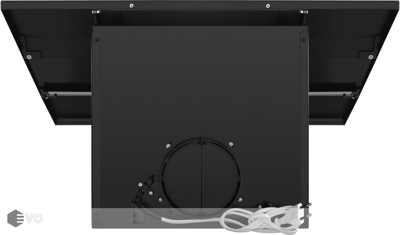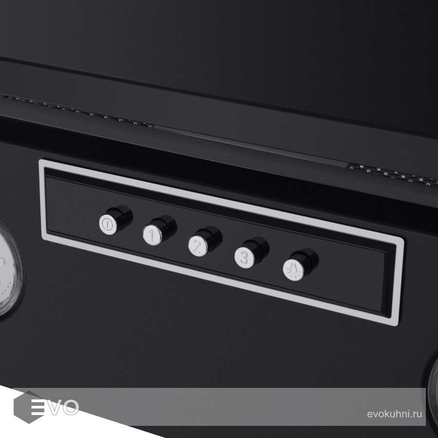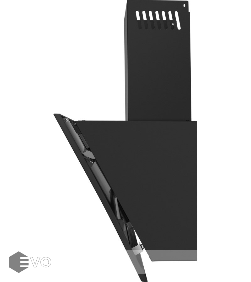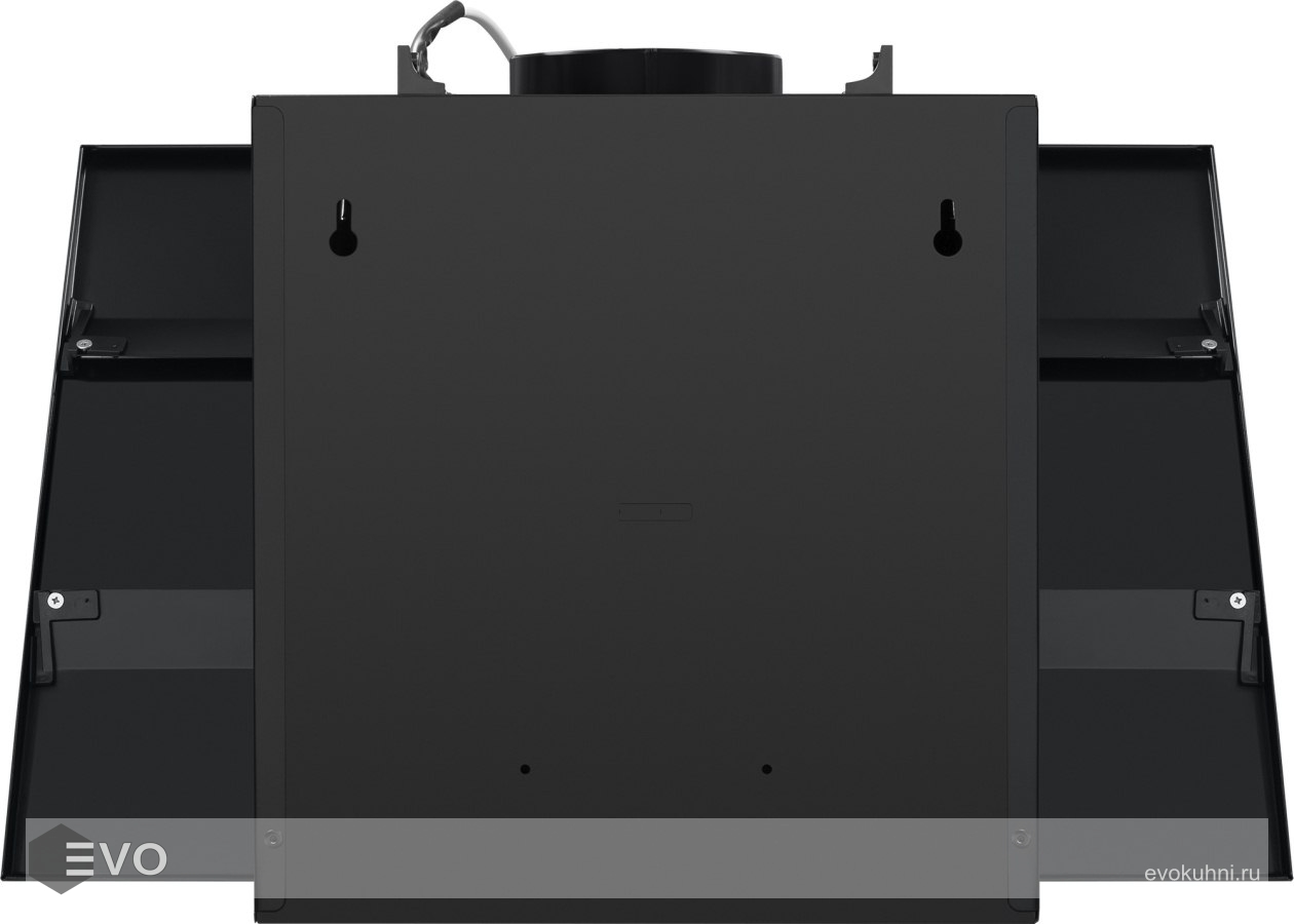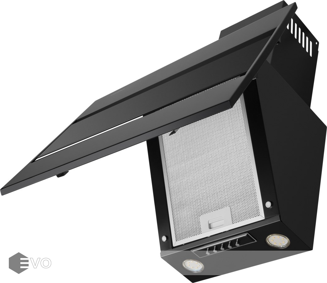 Корпус сделан из нержавеющей стали. Откидная панель, также выполненная из металла с эмалевым покрытием и вставкой из закаленного черного стекла, скрывает легко снимающийся жироулавливающий фильтр. Загрязненный воздух втягивается по периметру откидной панели.